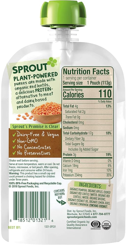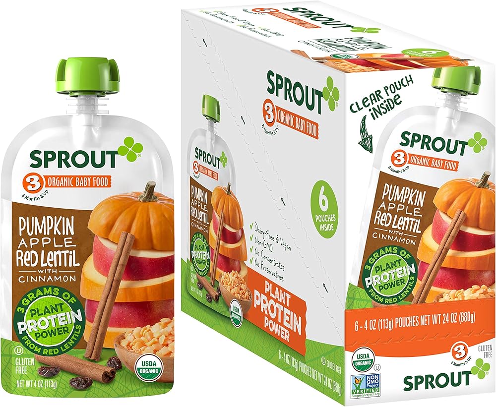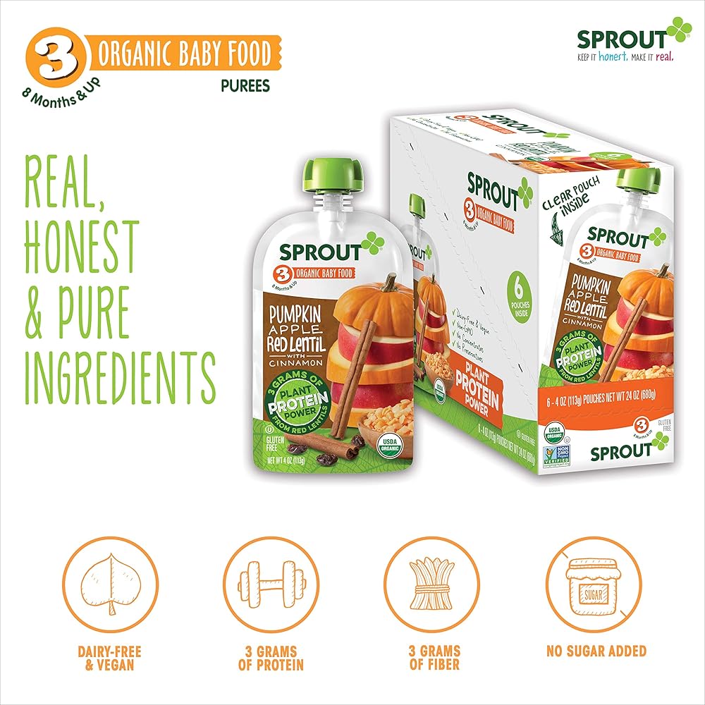 Sprout believes that a meal is more than nourishment. It's a chance to inspire and grow together. That's why we are committed to introducing an early love of healthy, whole organic foods to children everywhere. Research shows that starting babies on healthy foods early in development helps foster healthy eating habits through life. That's why we've crafted a variety of fruit, vegetable, & grain blends that help babies adapt to new flavors and textures and provide greater exposure to wholesome foods. Sprout Stage 3 Organic Baby Food purees are made from whole foods and contain no concentrates, additives, preservatives, or fillers of any kind – only real, honest, and pure ingredients. Formulated specifically for babies 8 months and up, Sprout Stage 3 purees are heartier meal options perfect for babies trying new textures and learning to self-feed. Sprout offers both meat-based and vegan meal options to satisfy a variety of diets, with protein and fiber to keep your little one feeling full throughout the day. Sprout Is Committed To: Whole Foods Certified Organic, Non-GMO Ingredients No Concentrates No Preservatives 100% BPA-Free PackagingSprout is committed to reducing the processing steps to keep our recipes as close to how mother nature intended – right from the earth. We procure ingredients from only certified-organic growers and will not accept harvested ingredients with any preservatives. We rigorously source these special ingredients to ensure the cleanest and safest recipes are delivered to your family. Our #1 goal at Sprout is to provide you and your family with the highest quality products. If for any reason you are not completely satisfied with any Sprout product, please contact us directly.