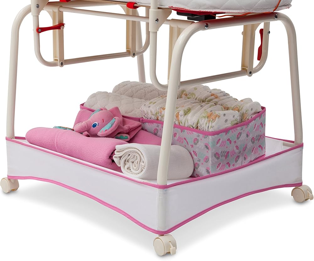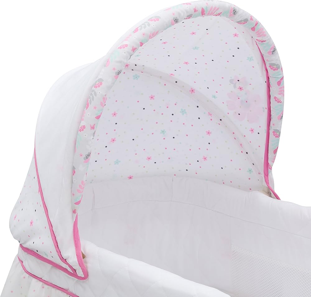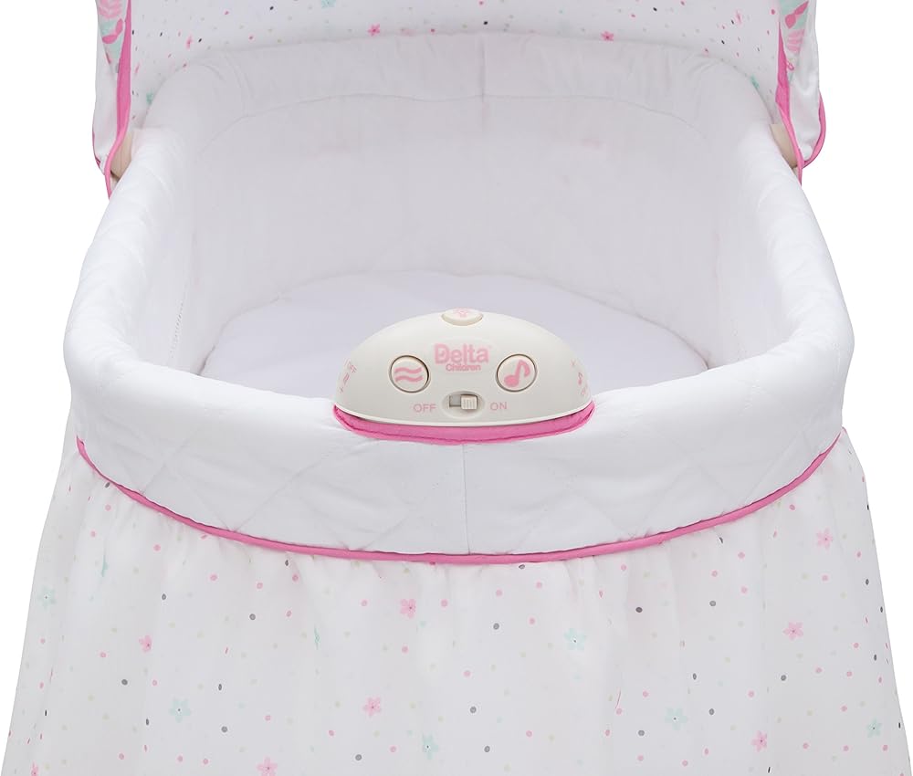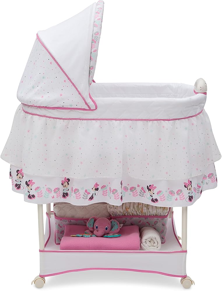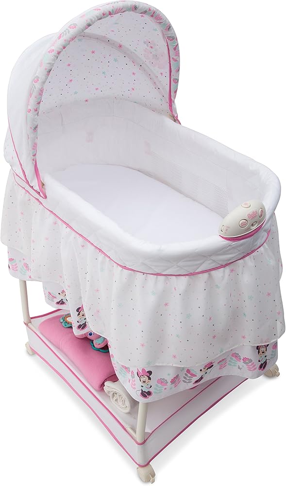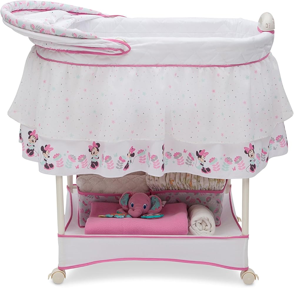 Make your girl's space extra-special with a little help from Mickey's main squeeze, Minnie Mouse. The Disney Minnie Boutique Gliding Bassinet by Delta Children is designed with sweet, artful illustrations of Minnie and boasts an electronic music module with nightlight and gentle vibration that helps little ones sleep. Outfitted with a large storage basket underneath, a gliding base and locking casters, it makes bedtime easier on parents and babies. This bassinet is recommended for babies 0-5 months. Stop use at 5 months or once your infant begins to push up on their hands and knees, whichever comes first. About Disney Baby: Shopping for Baby doesn't have to be an ordinary task - it can be a joyful discovery that starts with us and ends in your nursery, living room, and every place you interact with your little one. We take pride in helping families connect by offering apparel, gear, toys, bedding and other items that inspire every moment of the day. We're here to help your little character grow up, just as you grew up, with the magic of Disney. Disney Baby. Creating magical moments right from the start.