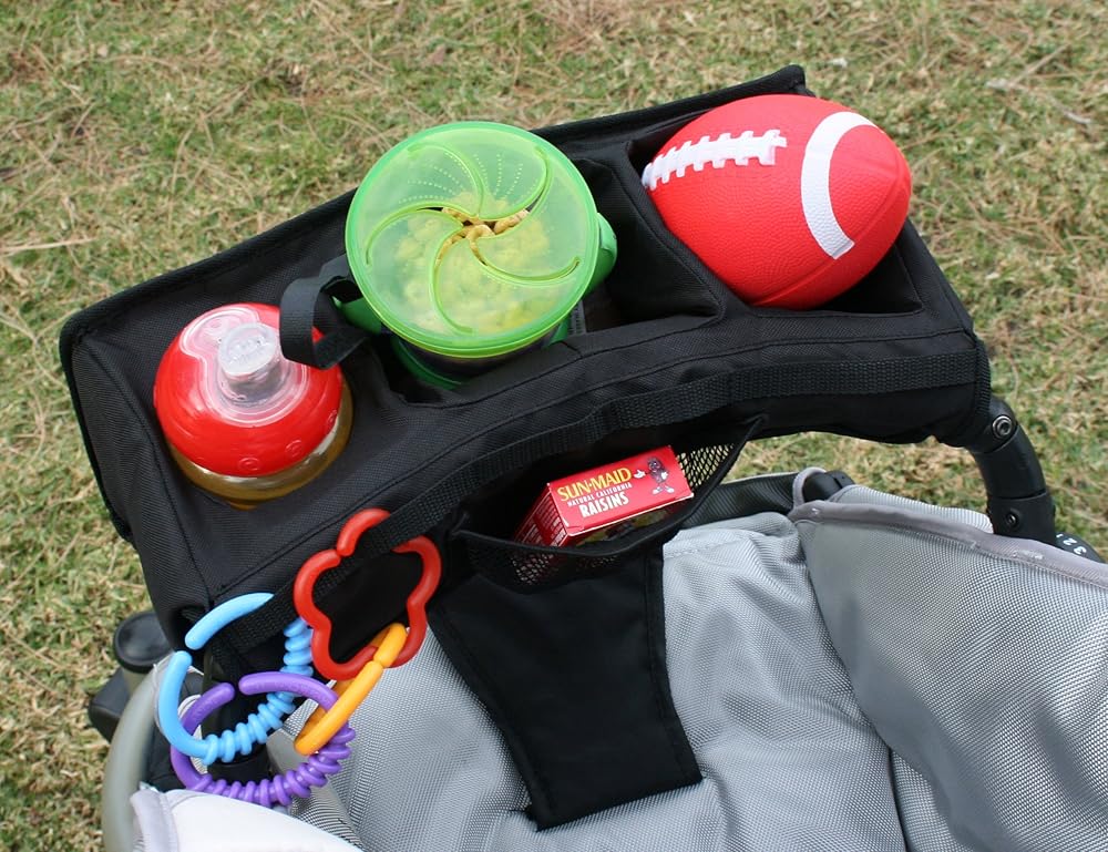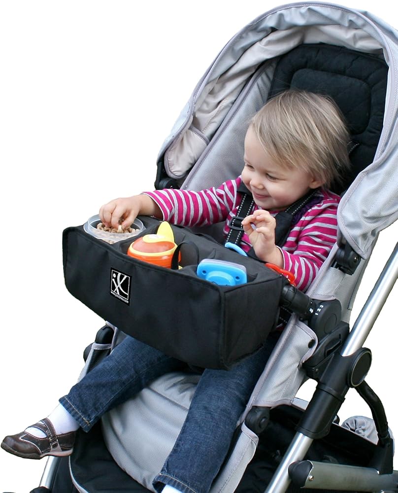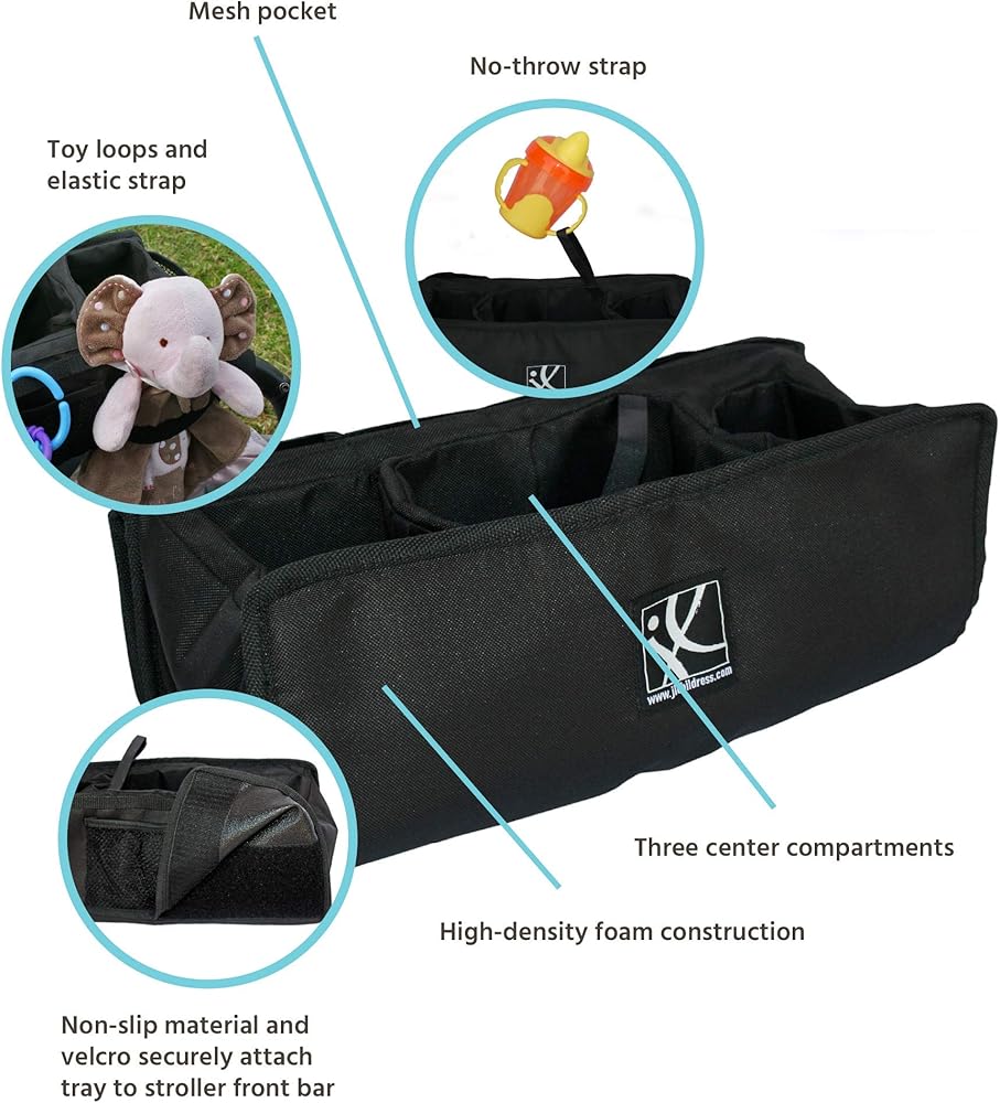 • The Food ‘N Fun Toddler Tray securely attaches over the stroller front bar with a heavy-duty non-slip, hook & loop strap. The tray is functionally designed to keep toddler's needs organized & within reach. Plenty of pockets, compartments and loops hold cups, snacks, and toys. A no-throw strap attaches to cup handles to prevent dropping and the tray's high-density foam construction provides rigidity. TIP: For best results, position the tray ON TOP of the stroller bar, tightly wrap the non-slip material around the stroller bar and attach the hook and loop. When an item is placed inside, the tray will rotate forward into position.