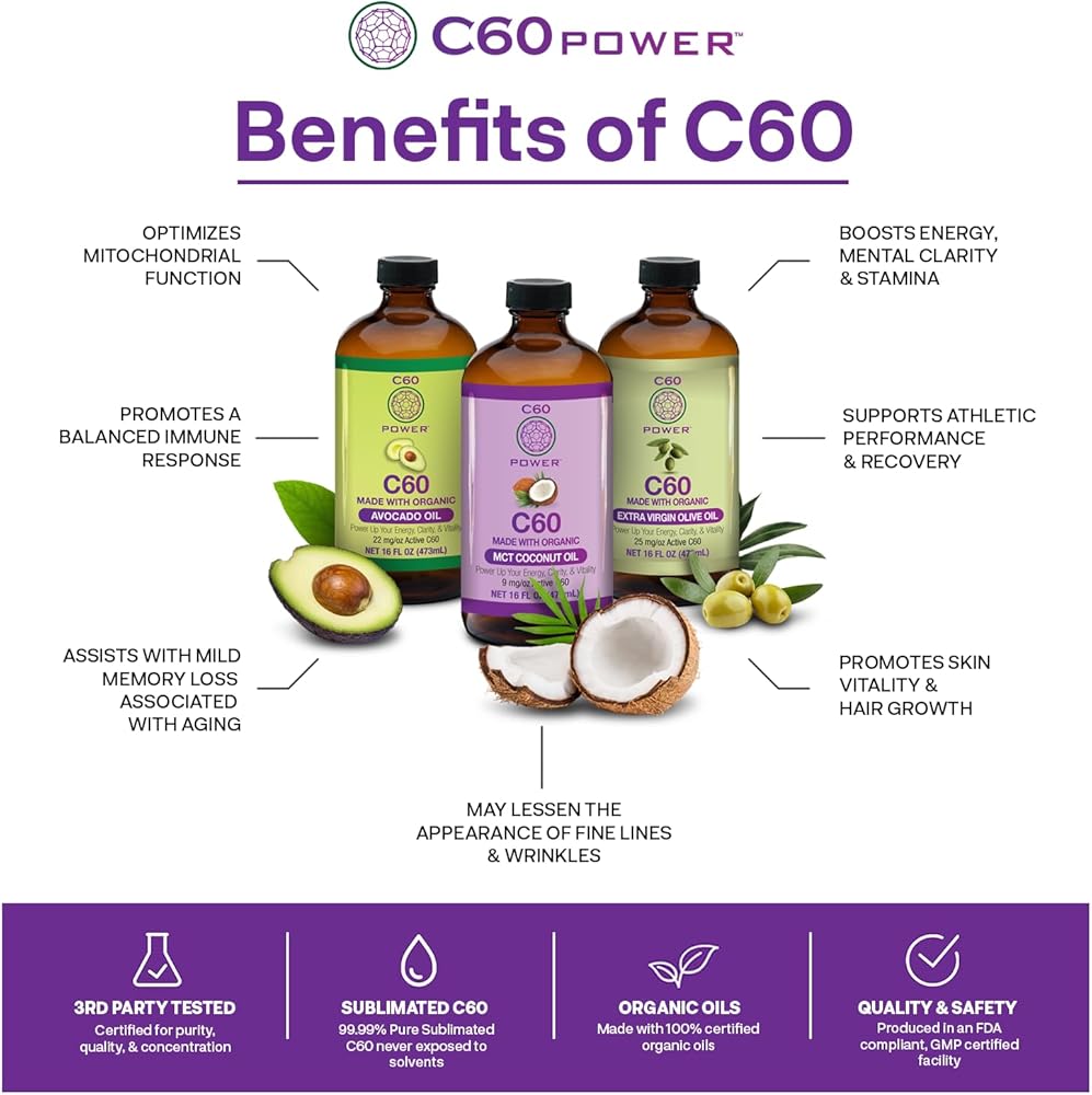 • اختر نكهتك: هل تتساءل عن نكهة C60 Purple Power الأفضل لك؟ يفضل زيت الأفوكادو العضوي أولئك الذين لديهم أجهزة هضمية أكثر حساسية أو الذين يفضلون الدهون التي يسهل هضمها إلى حد ما. زيت الزيتون البكر الممتاز العضوي هو المفضل لدى أولئك الذين يرغبون في خفض مستويات الكوليسترول لديهم. يُفضل زيت جوز الهند العضوي MCT من قبل أولئك الذين يعانون من مشاكل عدم توازن الجلوكوز والرياضيين للحصول على طاقة إضافية.