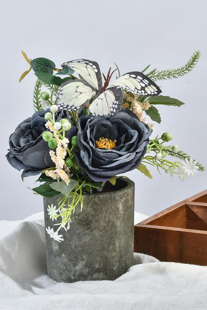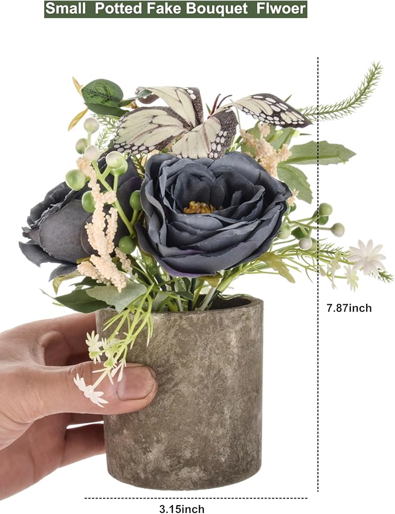 المواد: باقة وعاء نبات الزهور الصناعية الصغيرة مصنوعة من الحرير والبلاستيك عالي الجودة، وكل وعاء من اللب يحتوي على تربة إسفنجية صناعية مقلدة. الوعاء مصنوع من لب صديق للبيئة، يرجى عدم وضعه في الماء.