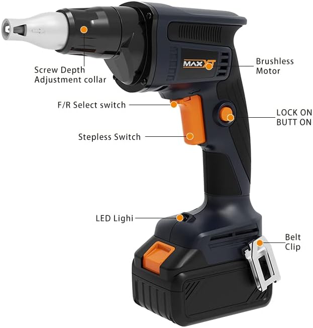 مفك الحوائط الجافة اللاسلكي MAXXT 20 فولت L-ion، سرعة قابلة للتعديل 0-4200 دورة في الدقيقة والعمق، لتطبيقات بناء الحوائط الجافة والتجميع والأرضيات والمبارزة والأسقف والسطح