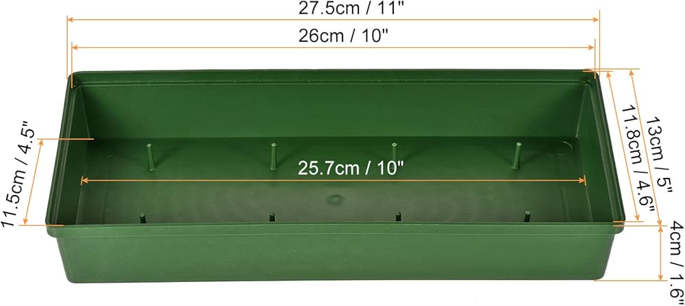 أوعية بتصميم أخضر بحجم: 27.5 سم × 13 سم × 4 سم/11 بوصة × 5 بوصة × 1.6 بوصة الحجم الكلي، 25.7 سم × 11.5 سم/10 بوصة × 4.5 بوصة الحجم الداخلي السفلي، 26 سم × 11.8 سم/10 بوصة × 4.6 بوصة الحجم الداخلي العلوي.