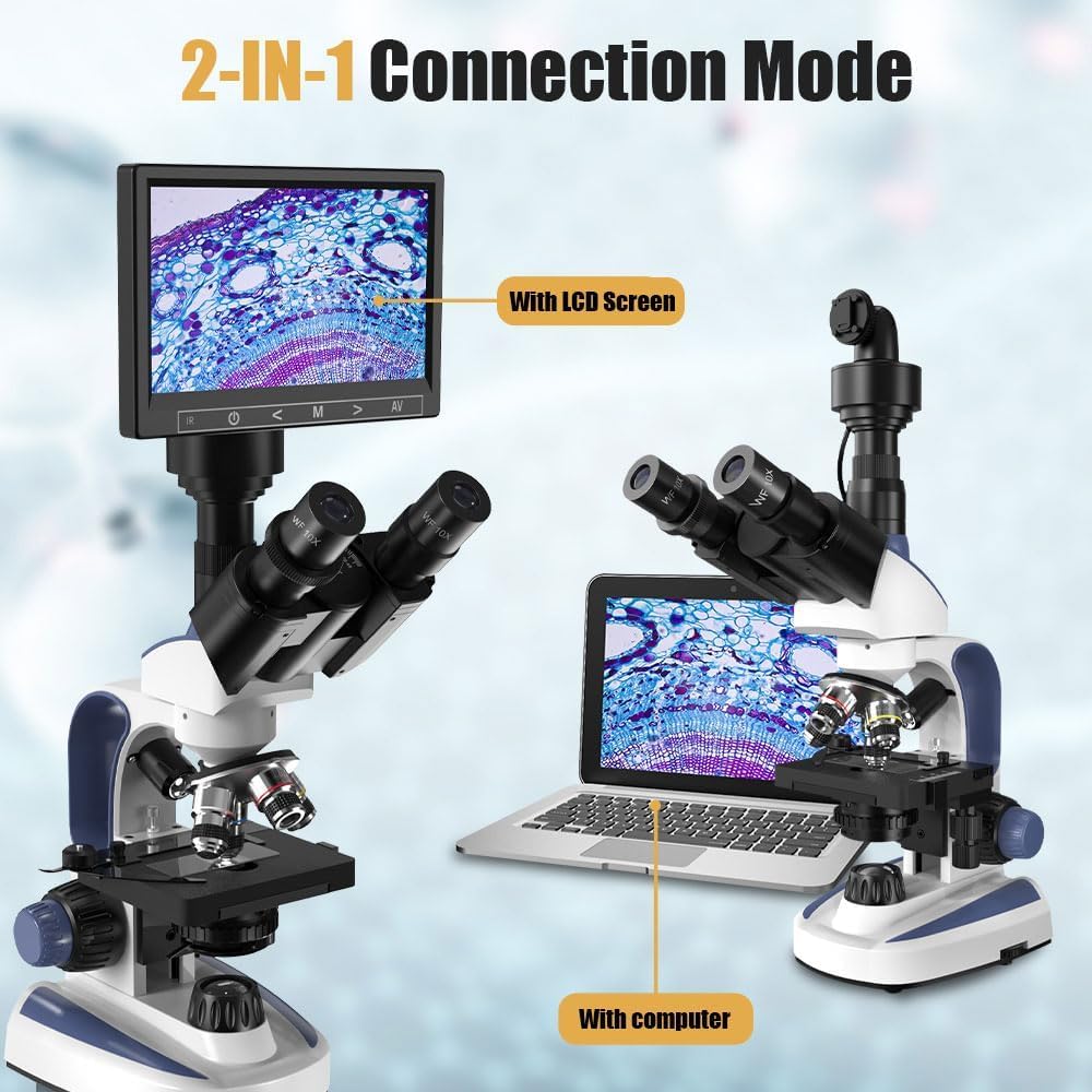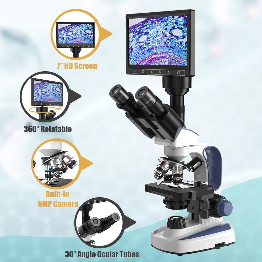 مجهر ثلاثي العينيات مركب من EDKKIE، تكبير 40X-2500X، كاميرا مدمجة 5 ميجابكسل مع شاشة 7 بوصات، رأس Sidetopf، مجهر من فئة البحث للبالغين، مرحلة ميكانيكية مزدوجة الطبقة