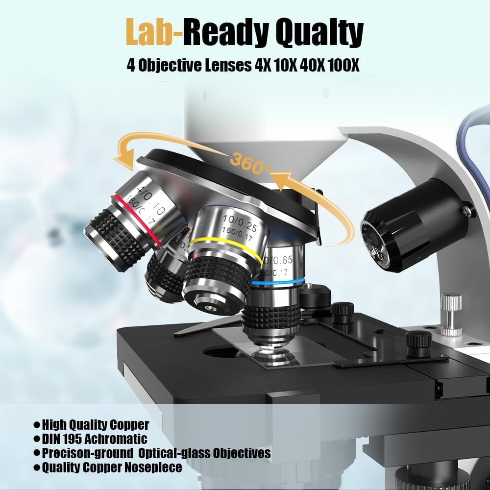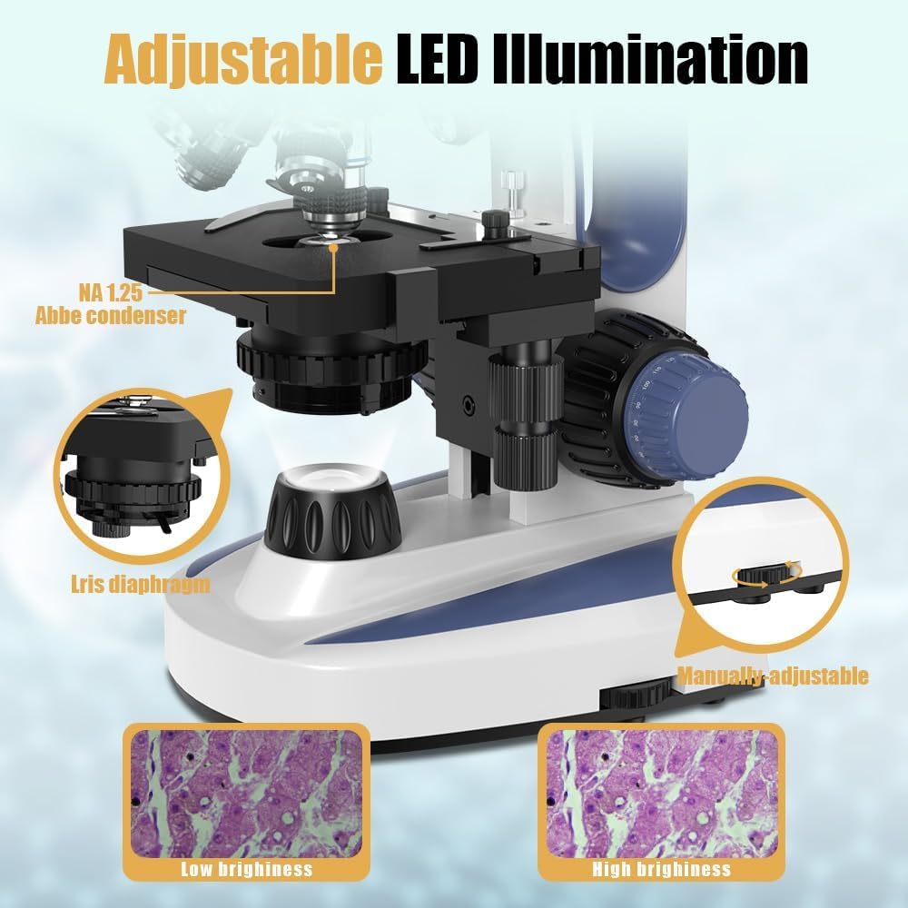 التكبير المحسن: مزود بعدسات واسعة النطاق 10X و25X، يوفر هذا المجهر المركب خيارات تكبير متعددة الاستخدامات، بما في ذلك 40X، و100X، و250X، و400X، و1000X، و2500X.