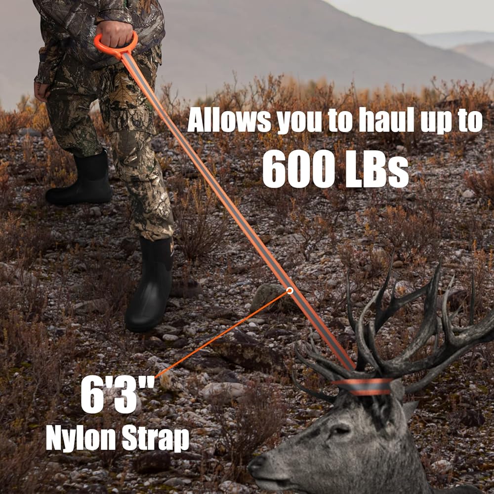 Up to 600lbs: Made from professional hunting nylon, 6'3.6” deer drag rope allows that you haul up to 600lbs. Not only perfect for the biggest of deer but also for hauling wood logs, trees, elks, heavy hunting gear, animal feed, turkeys, etc, becomes the first choice of the big or small game.