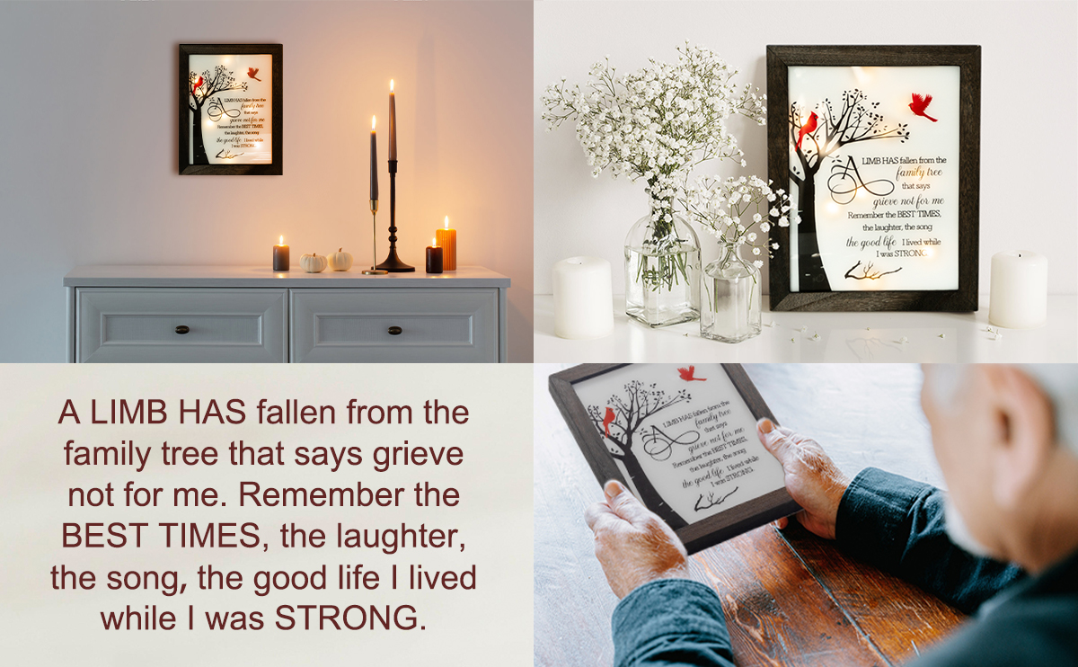 صندوق ظلال عالي الجودة: صندوق الظل التذكاري (10 × 8 انش) مطلي بالكربون لجعله متينًا ومقاوم للماء ومقاوم للتآكل. لمس قصيدة "A Fallen Limb" التي تم رشها بالأشعة فوق البنفسجية على الزجاج المقاوم للكسر. سلة هدايا التعازي هذه للضياع ليس من السهل تشويهها أو تلاشيها، الطباعة واضحة وستدوم لفترة أطول بكثير من الزهور.