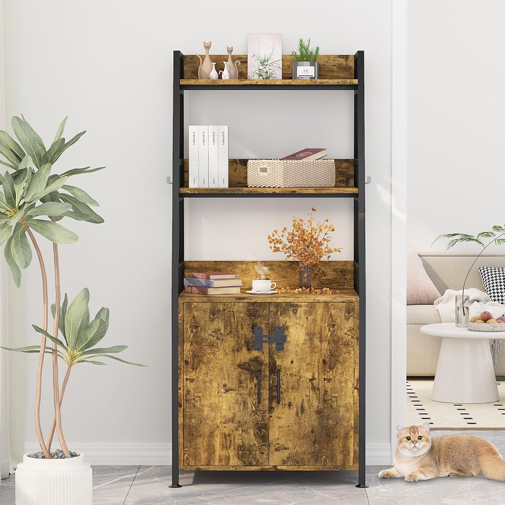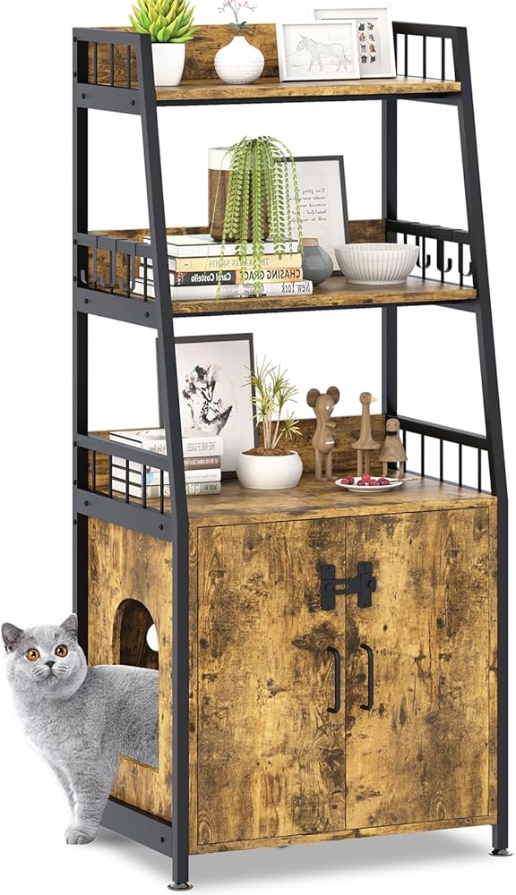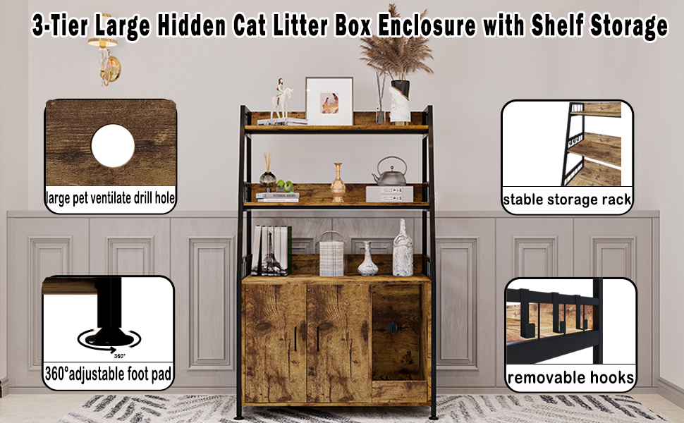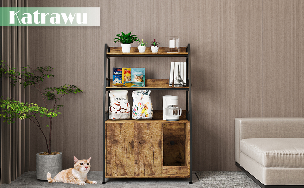 رف تخزين مفتوح من طبقتين: يمكن استخدام الأرفف العلوية المفتوحة المكونة من طبقتين لتخزين طعام القطط أو فضلات القطط أو ألعاب القطط ووضع كتبك أو نباتاتك أو أشياء أخرى، مما يوفر لك المساحة والحفاظ على النبات. يمكنك وضع صندوق فضلات القطط في غرفة المعيشة أو غرفة النوم أو المطبخ أو غرفة الغسيل أو حتى الحمام.