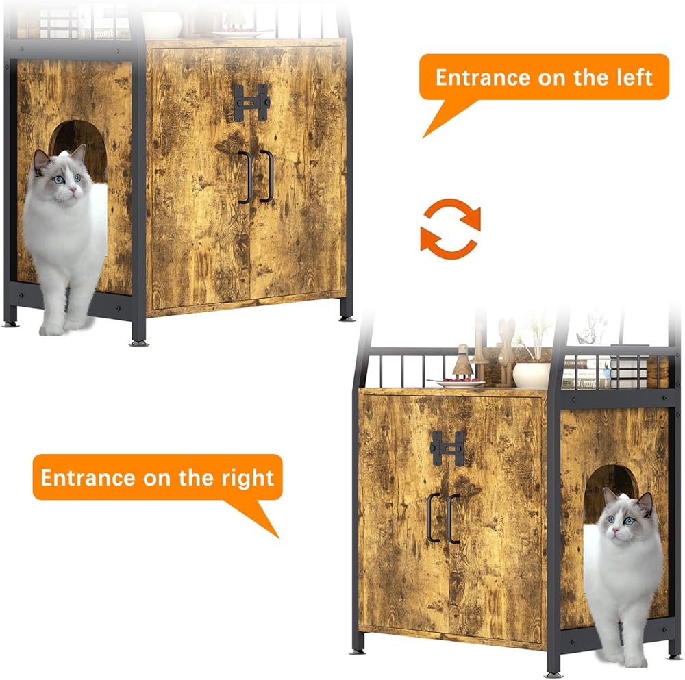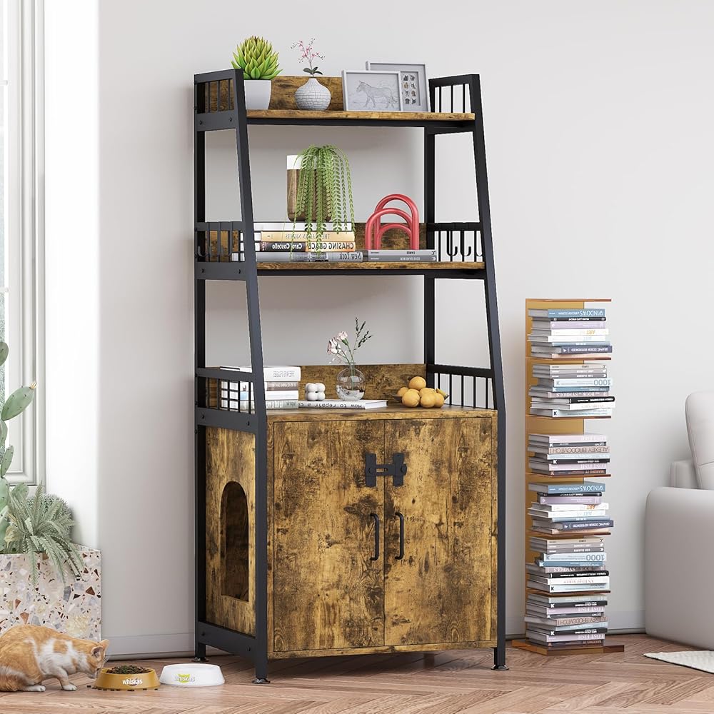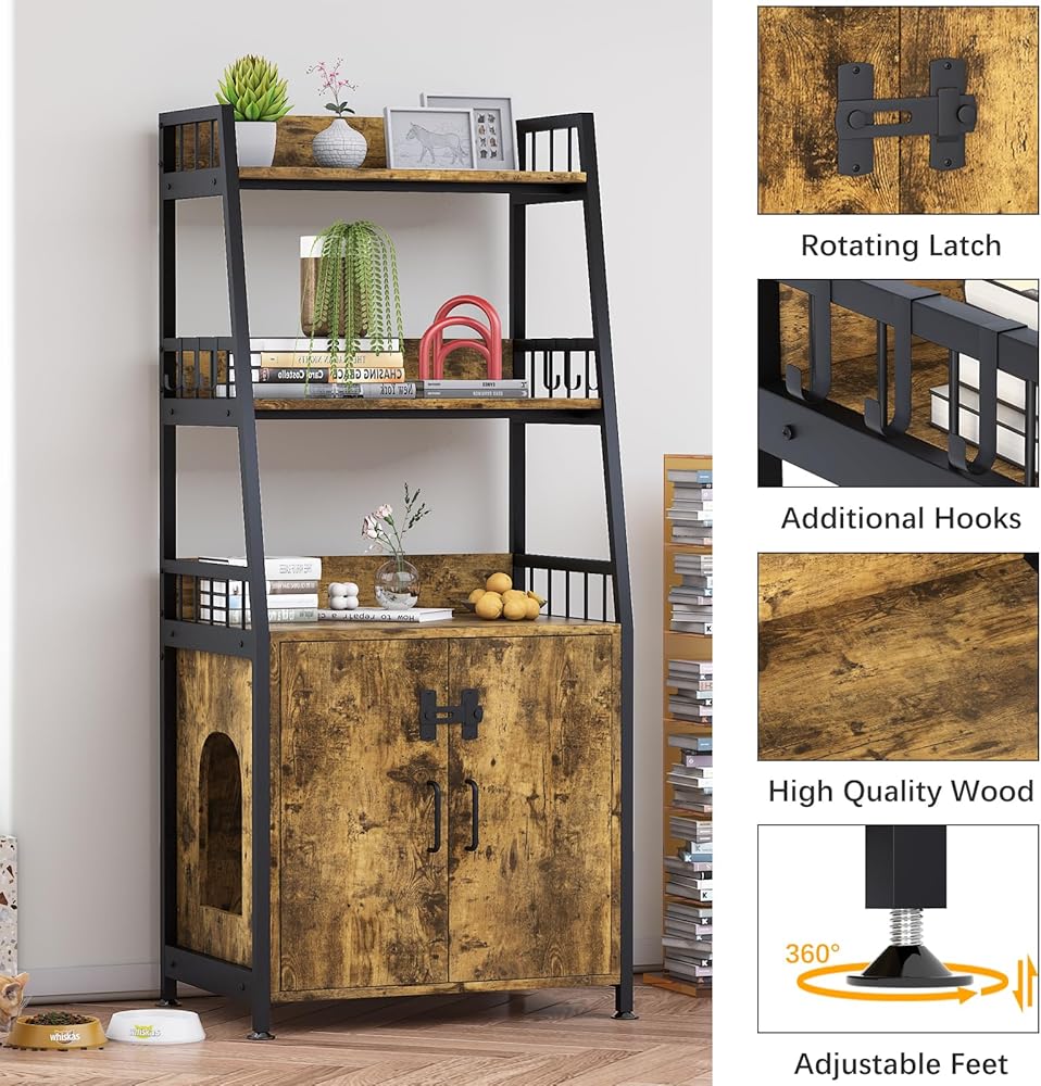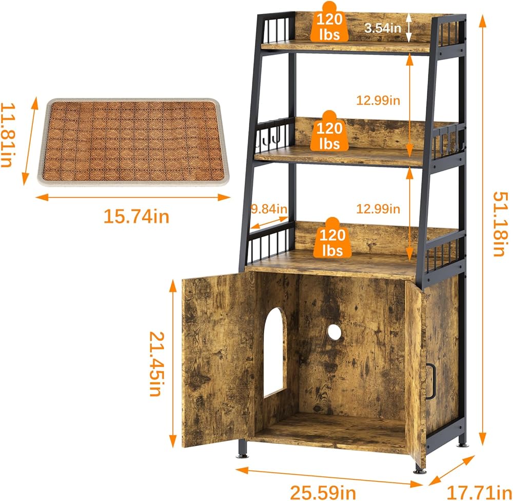 صندوق فضلات القطط مع ارفف من كاتراو، صندوق فضلات قطط كبير مخفي، رف اثاث خشبي للقطط مع باب، اثاث حمام القطط، بني ريفي، 52 انش