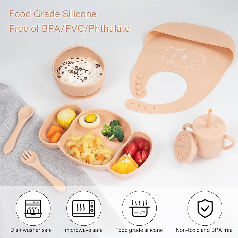 【Silicone Baby Feeding Set】The baby silicone feeding set comes with everything you need to start your first stage of baby-led weaning - 1 suction divided plate, 1 silicone bowl, 1 silicone bib,1 sippy cup with straw and lid, 1 snack cup lid, 1 spoon, and 1 fork. .This feeding set makes it easy for your baby to become independently feeding!