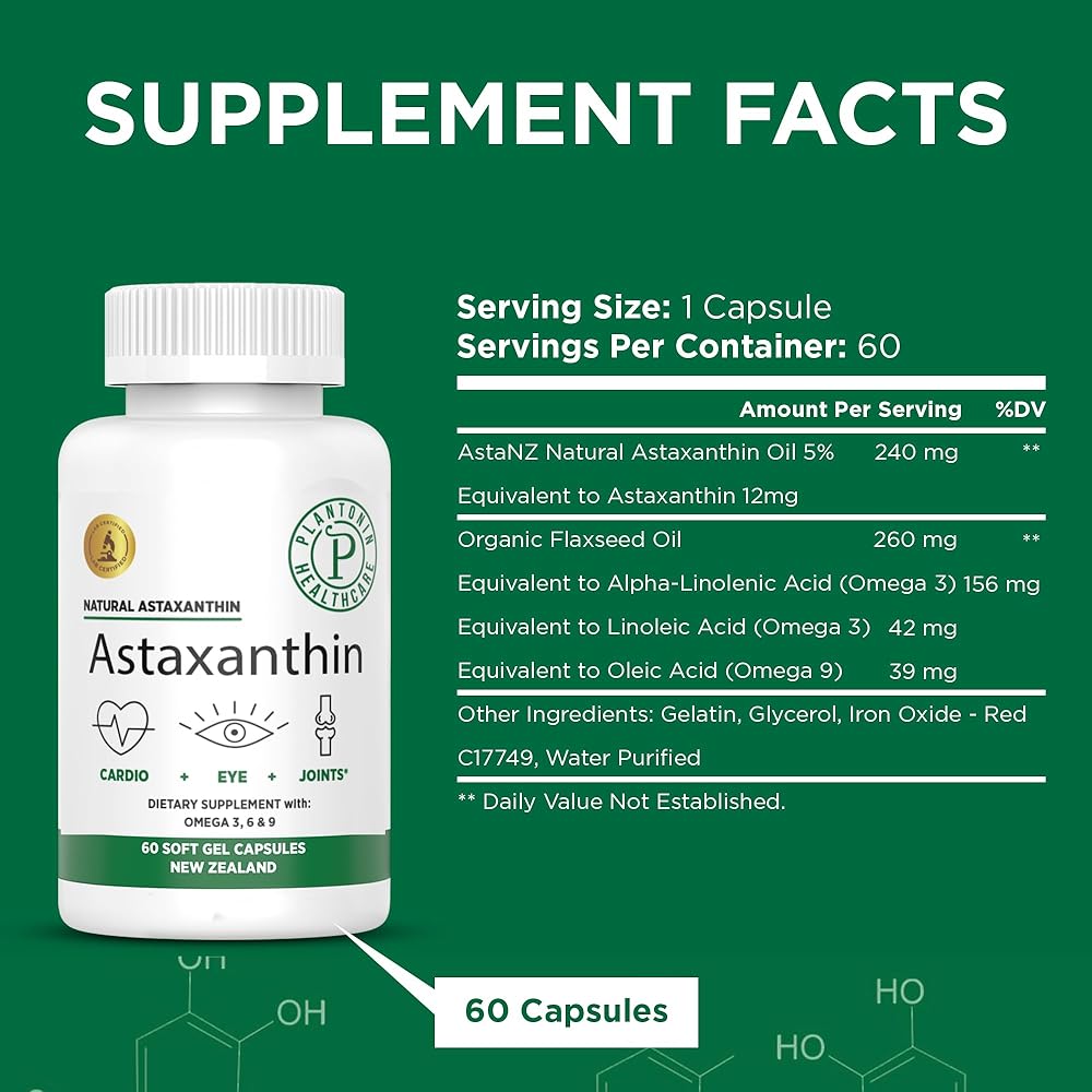 Plantonin AstaNZ (60 Capsules)-Supplement for Cardio Recovery, Skin, Eye and Joint Health Support for Sports People – New Zealand Natural Astaxanthin with Organic Flaxseed Oil with Omega 3, 6 and 9