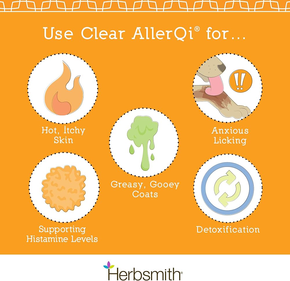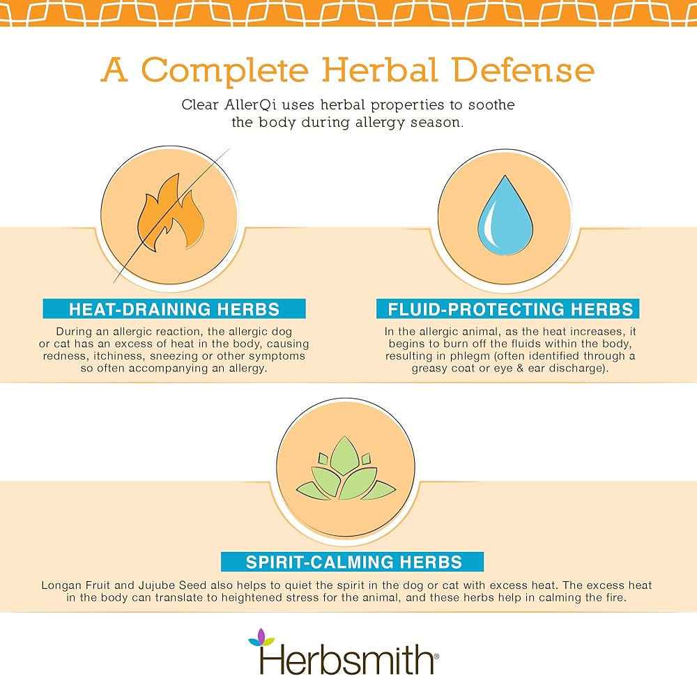 Clear AllerQi naturally cools skin and is recommended for use in dogs and cats with seasonal allergies. An allergy is a hypersensitivity reaction to food, inhalant, or contact. The body's defenses are signaled into an overreaction to a particular substance. This hypersensitivity often causes extreme heat in the animal, seen as reddened skin, hot weepy lesions, panting, restlessness and skin that may be hot to the touch. Herbsmith Clear AllerQi has herbs that cool heat and harmonize the body's defenses to help support normal skin functions. made in the U.S.A.