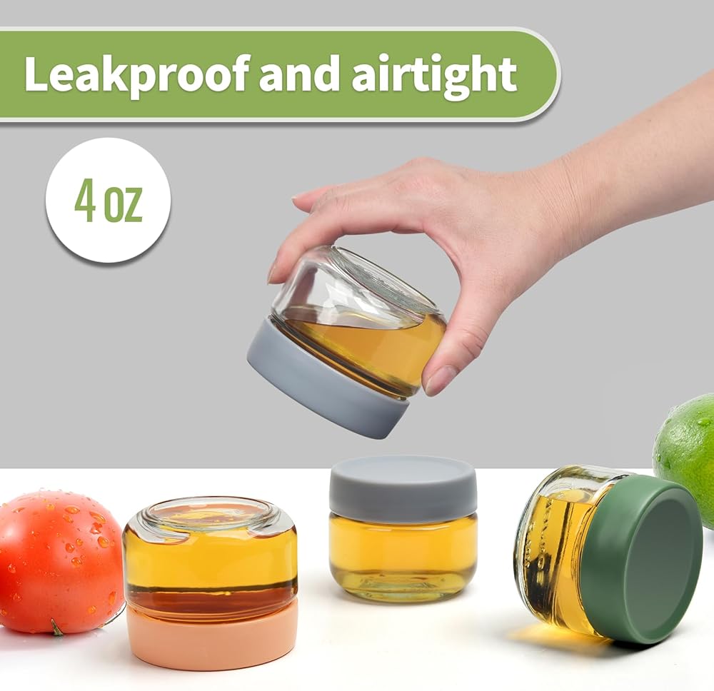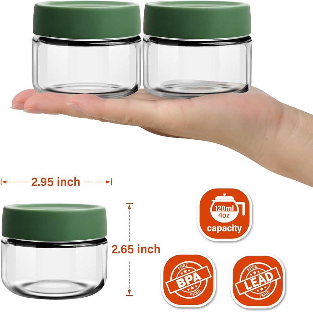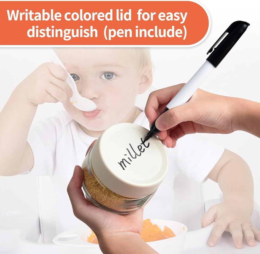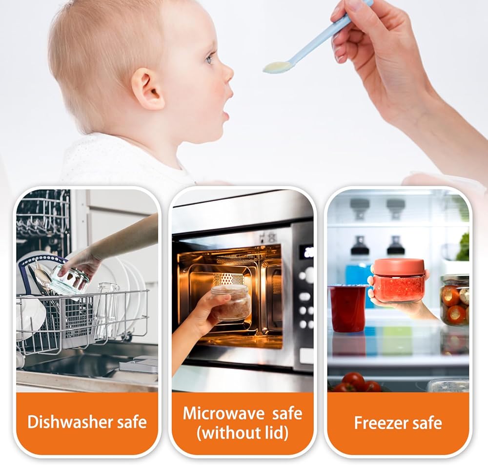 مواد آمنة غذائياً: برطمانات طعام الأطفال الصغيرة هذه مصنوعة من زجاج سميك للغاية مع بلاستيك PP5 سميك جدًا، غير سام وعديم الرائحة. خالية من مادة BPA وخالية من الرصاص. شهادة CPSIA!