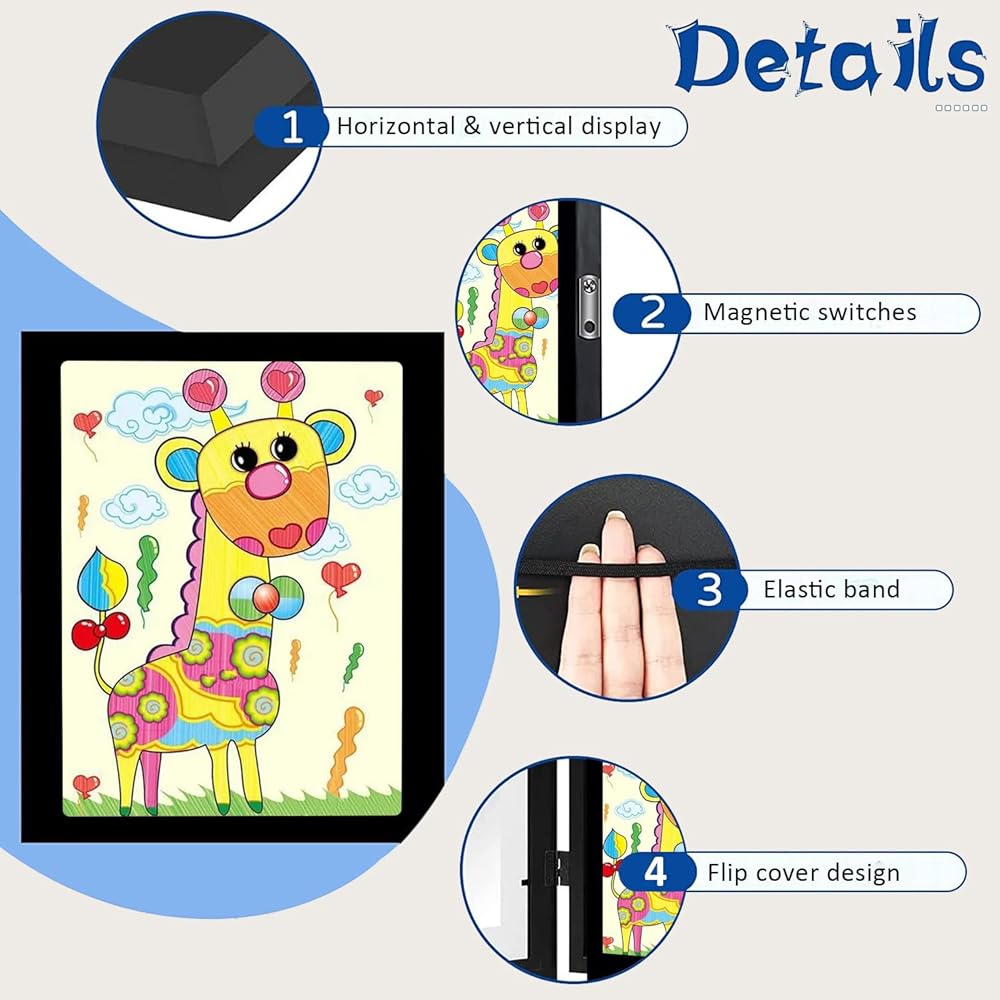 🍓【سهولة التشغيل】إطار العرض الفني المفتوح للأطفال مناسب جدًا لاستبدال الصور. إطار عمل فني للأطفال يتميز بلوحة صور ثابتة مزدوجة مع شريط مطاطي أسود. بالإضافة إلى ذلك، فهو مزود بتصميم مغناطيسي سهل الفتح والإغلاق من خلال مفصلة معدنية مفتوحة بزاوية 180 درجة.