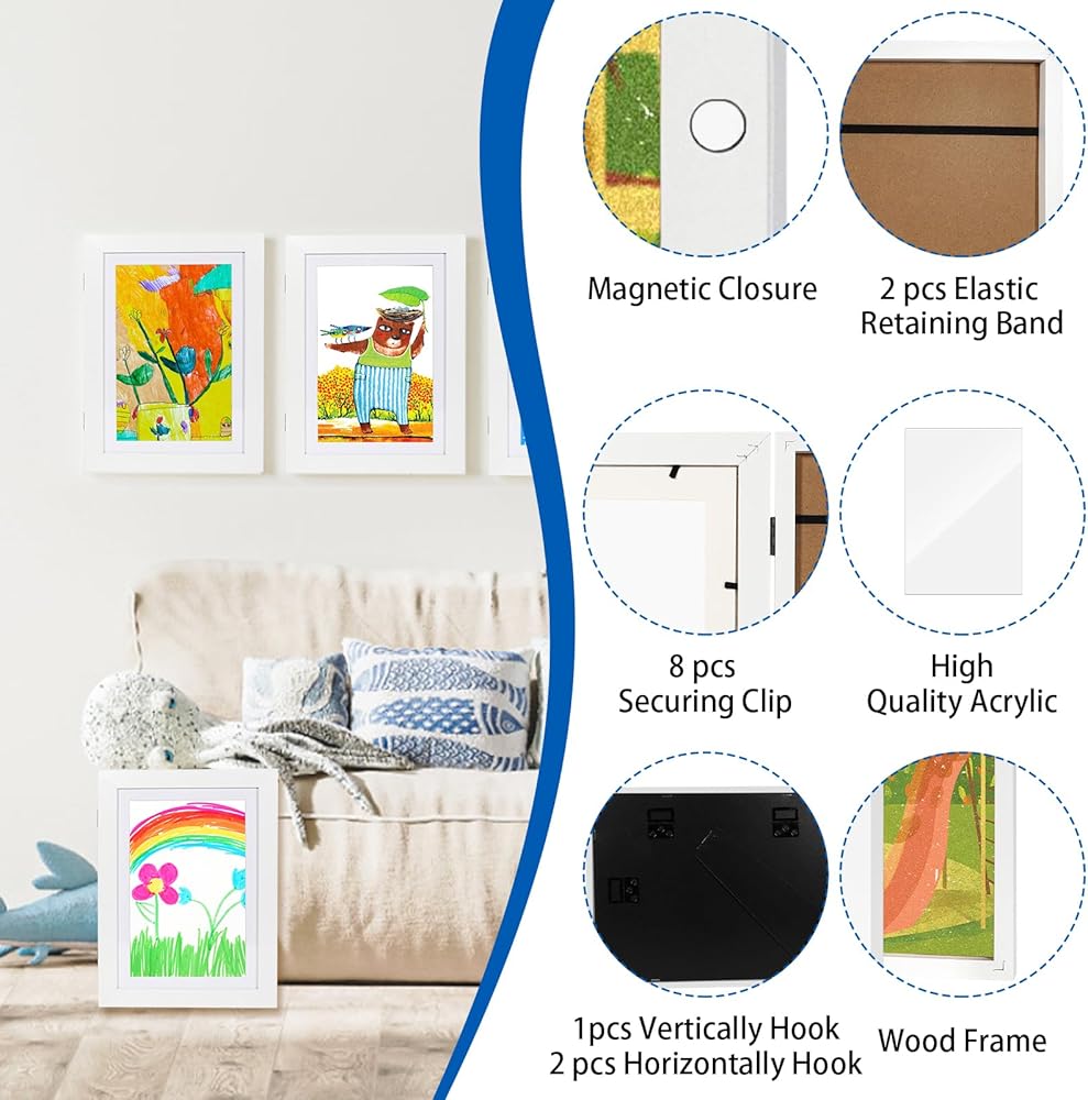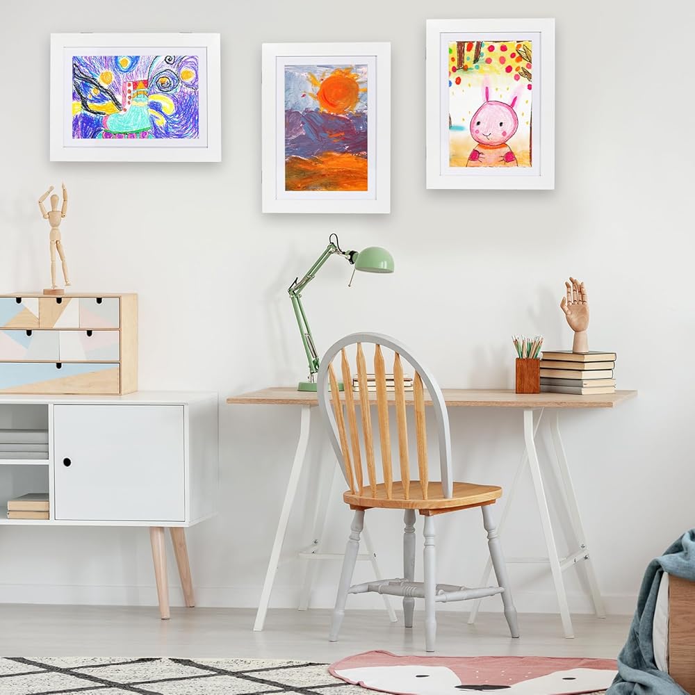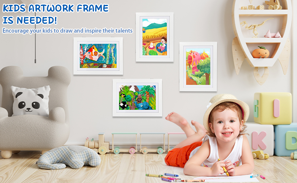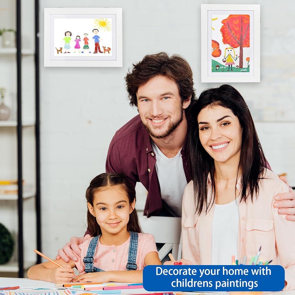 【إطار صور عالي الجودة】إطارات الصور الفنية للأطفال مصنوعة من صفائح أكريليك لامعة، مادة MDF عالية الجودة، قوية وغير هشة، استخدم إطار الصورة الأبيض الخاص بنا لحماية الأعمال الفنية الرائعة للأطفال، والحفاظ على ذكرياتهم الثمينة وعرضها.