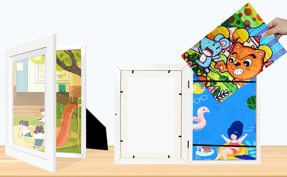 【تصميم إطارات العرض ذات الفتح الأمامي】: تصميم الفتح الأمامي يسمح لك بتغيير الصور مثل قلب الكتاب. يحتوي الإطار الفني للأطفال المطور على مفتاح إغلاق مغناطيسي لسهولة الفتح والإغلاق، و3 خطافات مسننة في الخلف لوضع أفقي أو رأسي؛ توجد وسادة مشطوفة خلف إطارات الأطفال للأعمال الفنية، والتي يمكن إمالتها على سطح المكتب أو أي مكان مسطح آخر. توفر المشاريع الفنية للأطفال رؤية واضحة وأجواء فنية للعمل الفني.