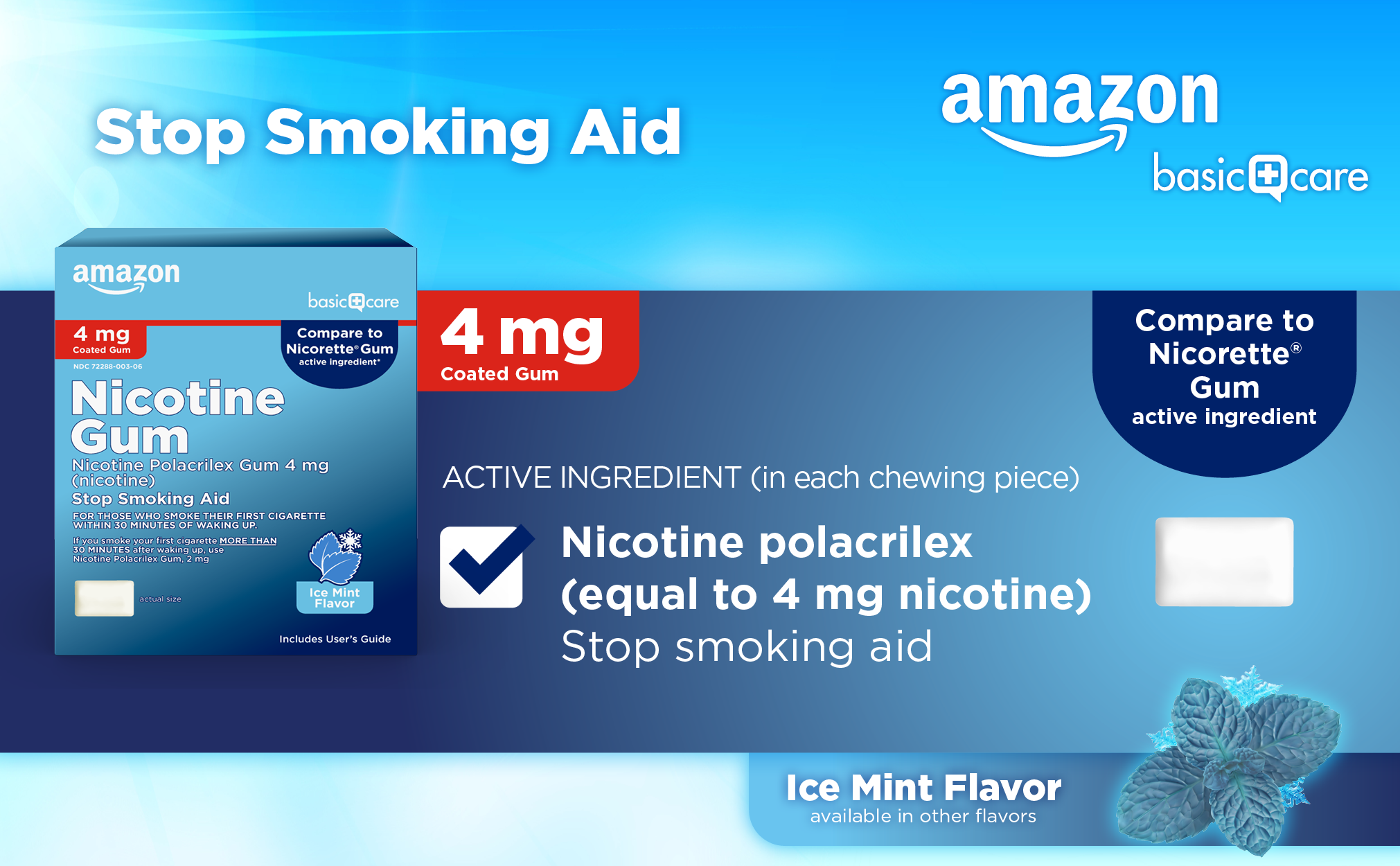 Compare to Nicorette Gum active ingredient. Double your chance to successfully quit smoking with Amazon Basic Care Coated Nicotine Polacrilex Gum 4 mg, Ice Mint Flavor (when used as directed with a support program. Many people require several quit attempts to stop smoking). This gum is a stop smoking aid for those who smoke their first cigarette within 30 minutes of waking up. This product is part of a Nicotine Replacement Therapy, which is designed to wean your body off cigarettes. It helps to regulate, control and gradually reduce your body's nicotine cravings. Smoking has two addictive components, a physical and a mental need for the nicotine in tobacco. Nicotine gum addresses the physical need to smoke by reducing withdrawal symptoms, including nicotine cravings. This ice mint flavored gum has a soft core, and each piece is coated for extreme flavor. Sugar free. Gluten free. American Cancer Society (ACS) supports nicotine replacement therapy to help people on their journey towards a smoke-free lifestyle.