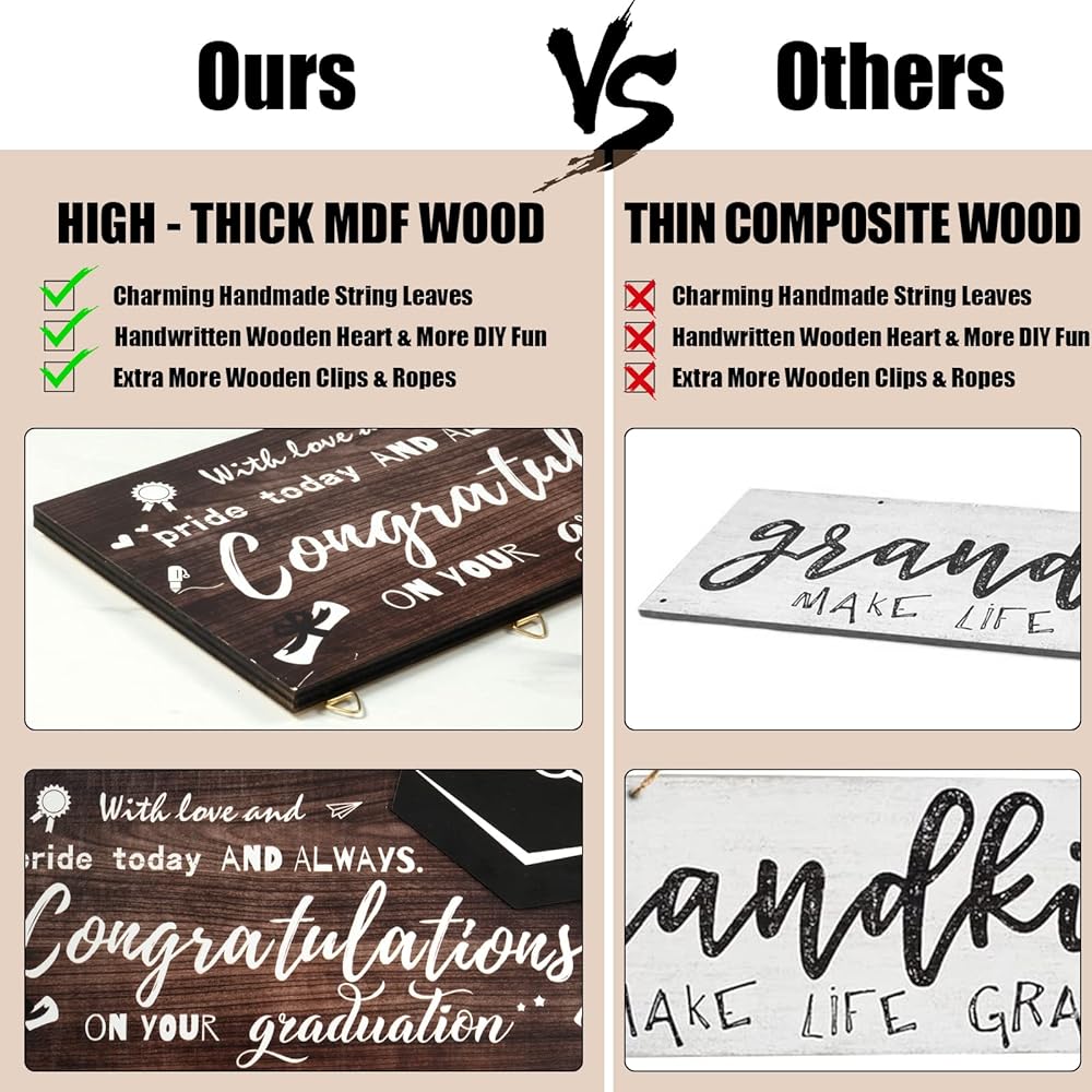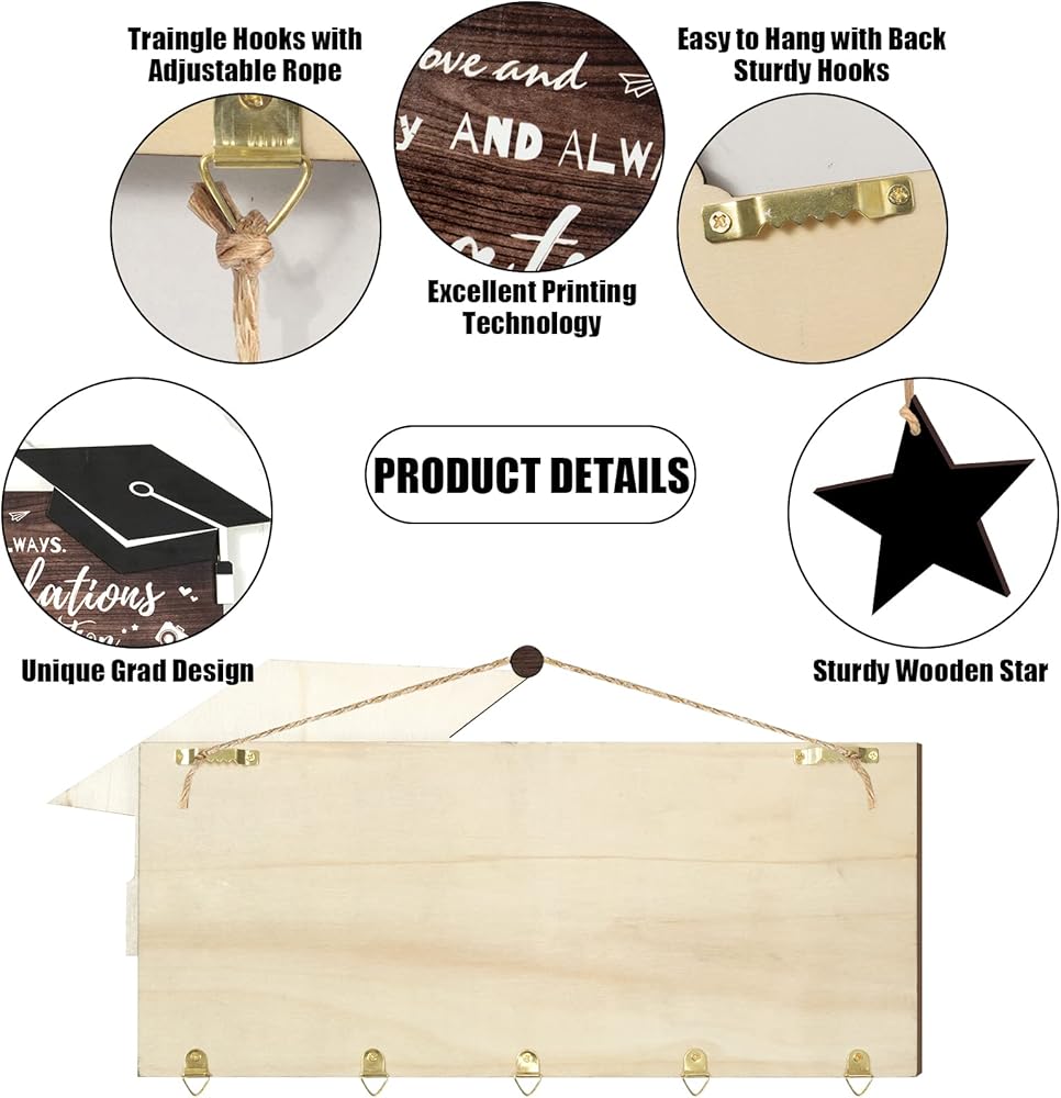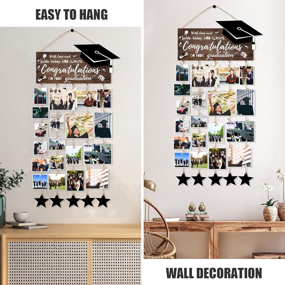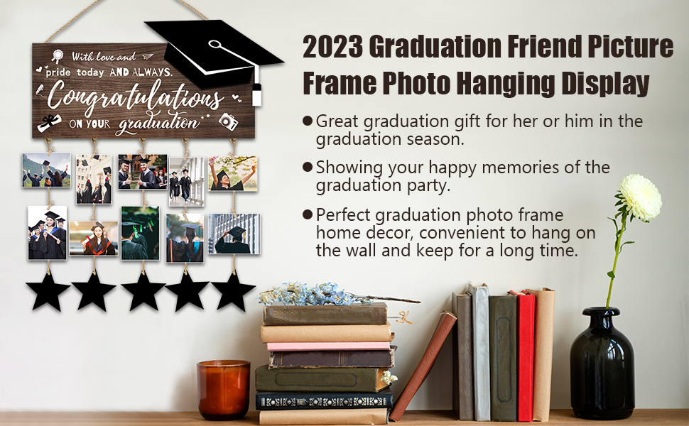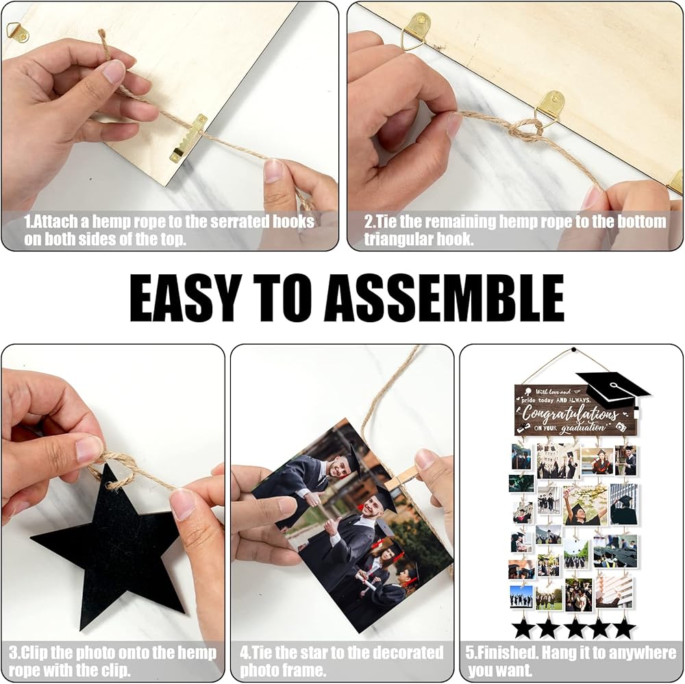 ✔️【استمتع بالمرح بنفسك】قم بتعليق مشابك صور التخرج عن طريق ربط الخيط من خلال الفتحات المحجوزة في الجزء السفلي، مما يسمح لك بتغيير الصور أو الصور المزخرفة كما تريد عن طريق إزالتها أو إضافتها.