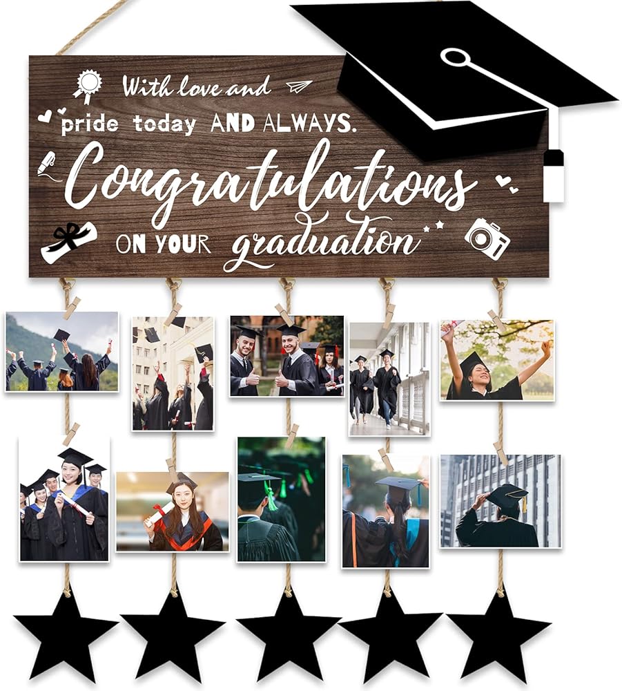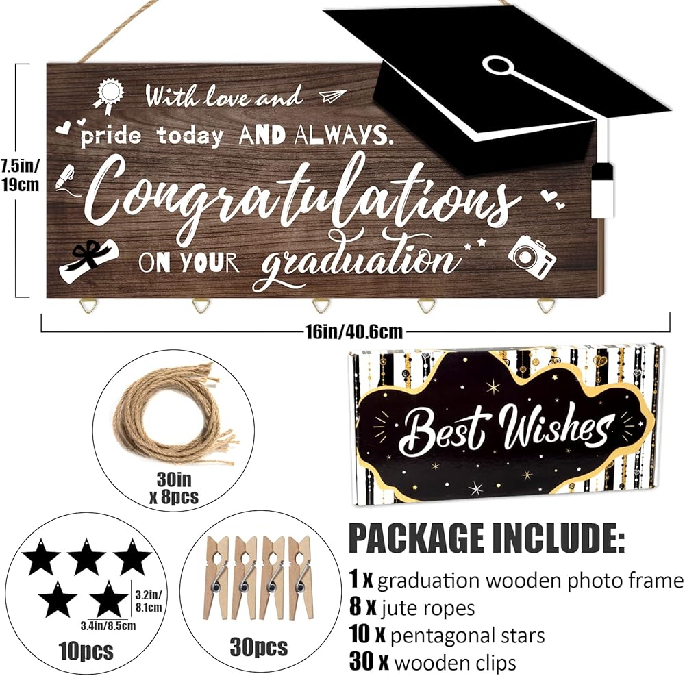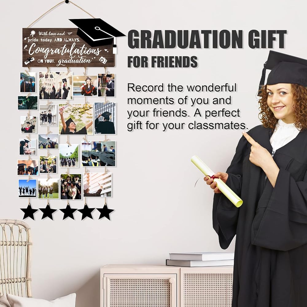 ✔️[إطار صورة متدرجة] تتضمن مجموعة هدايا التخرج لعام 2023 عرض صور التخرج مع 30 قطعة من المشابك الخشبية، و8 قطع نجوم وحبل من القنب، كافية لتلبية احتياجاتك التزيينية. هدية تخرج رائعة لها أو لها في موسم التخرج.
