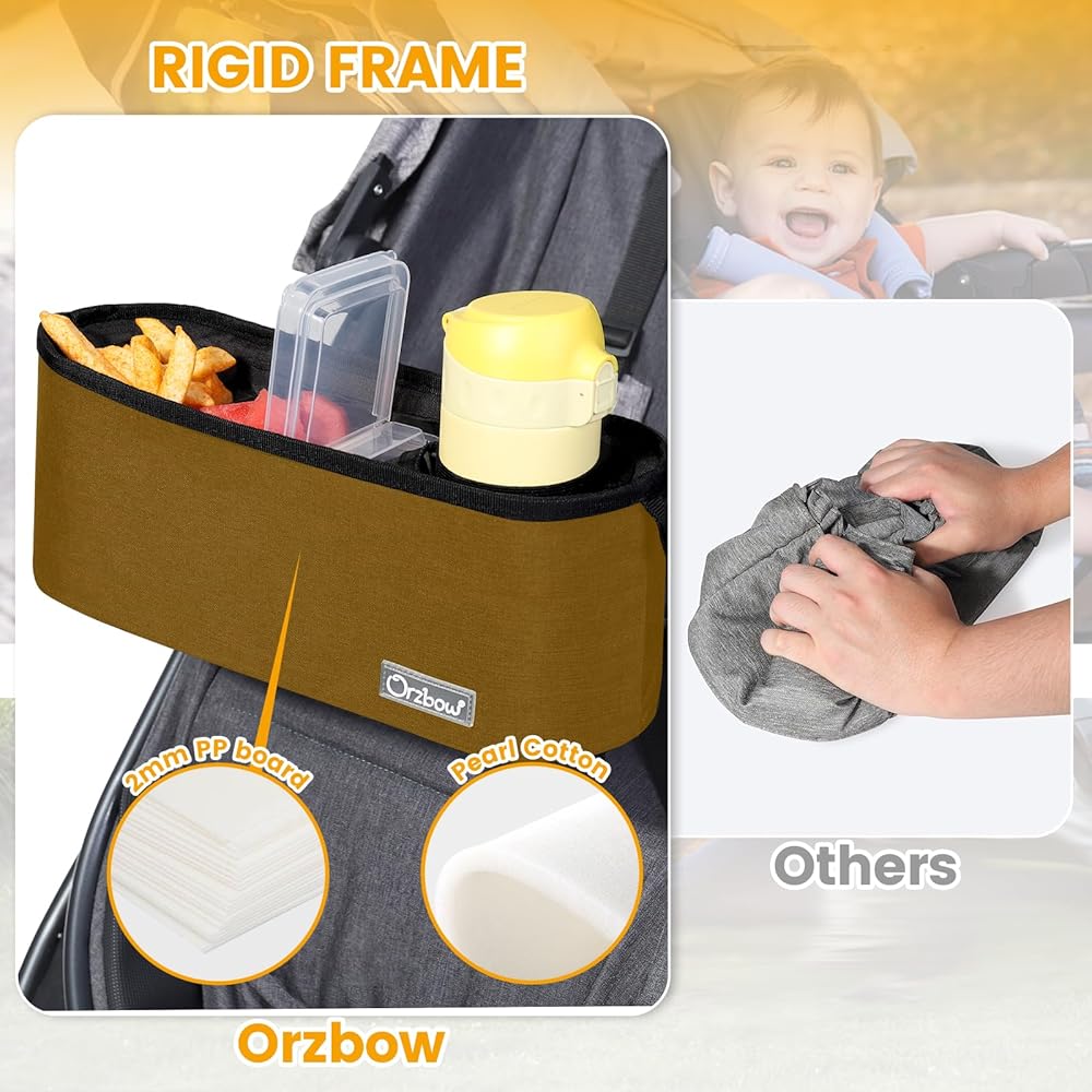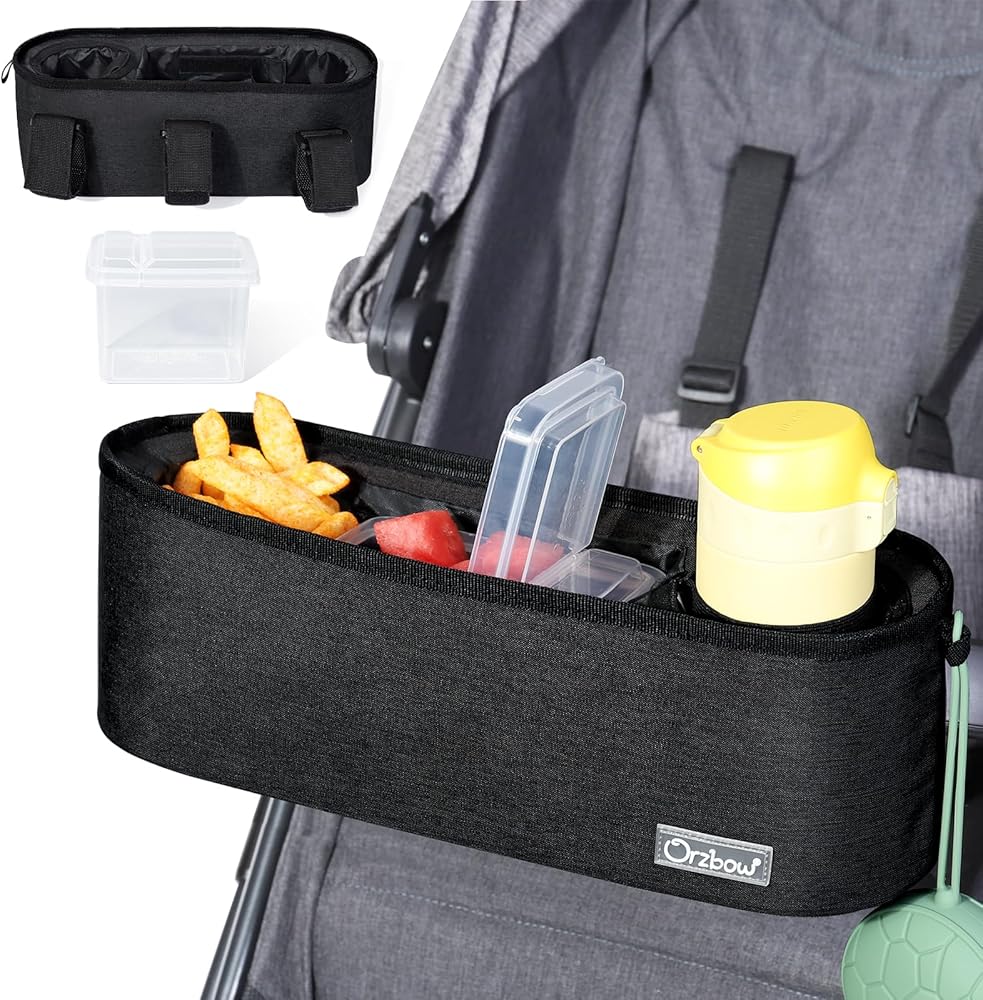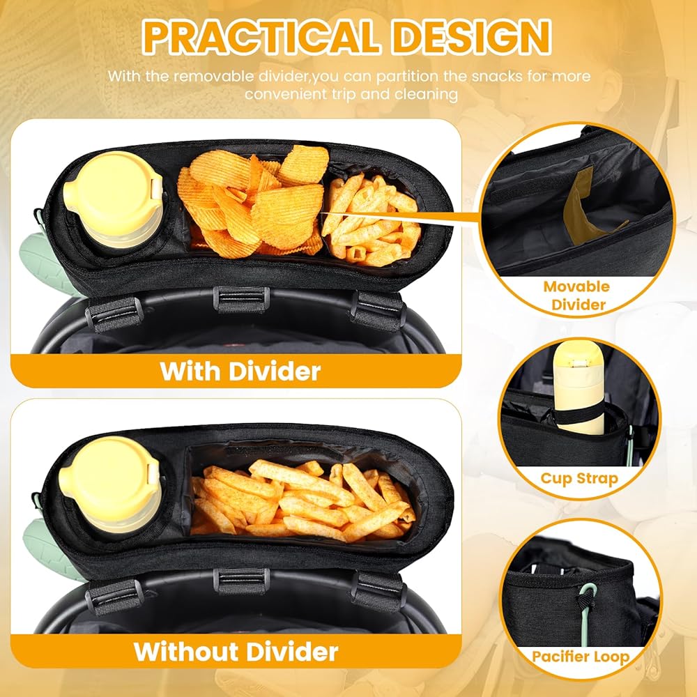 💡 𝐀𝐌𝐏𝐋𝐄 𝐒𝐓𝐎𝐑𝐀𝐆𝐄 𝐒𝐏𝐀𝐂𝐄: Orzbow Stroller Tray is equipped with a spacious snack compartment (7.9*3.2*4'') with a removable partition, allowing you to separate different snacks or items as needed, whose position can be adjusted flexibly and removed for easy cleaning.