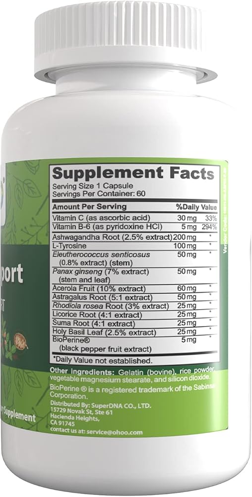 OHOO Adrenal Support Supplement is formulated with the adaptogenic herbs Ashwagandha, astragulus, Eleutherococcus senticosus, Panax ginseng, Acerola Fruit, Rhodiola rosea Root, Licorice Root, Suma Root, Holy Basil Leaf and other effective ingredients to ahelp you resolve adrenal fatigue symptoms and restore energy levels.