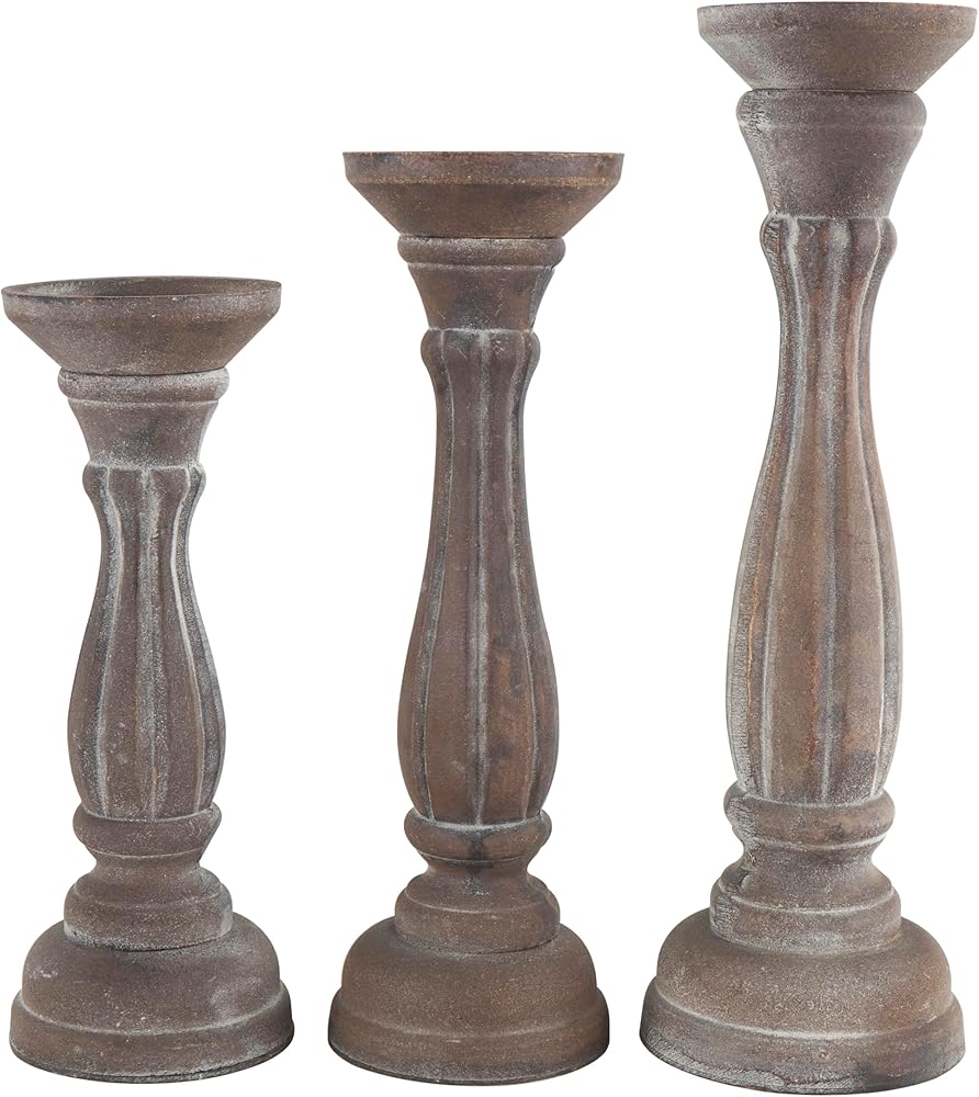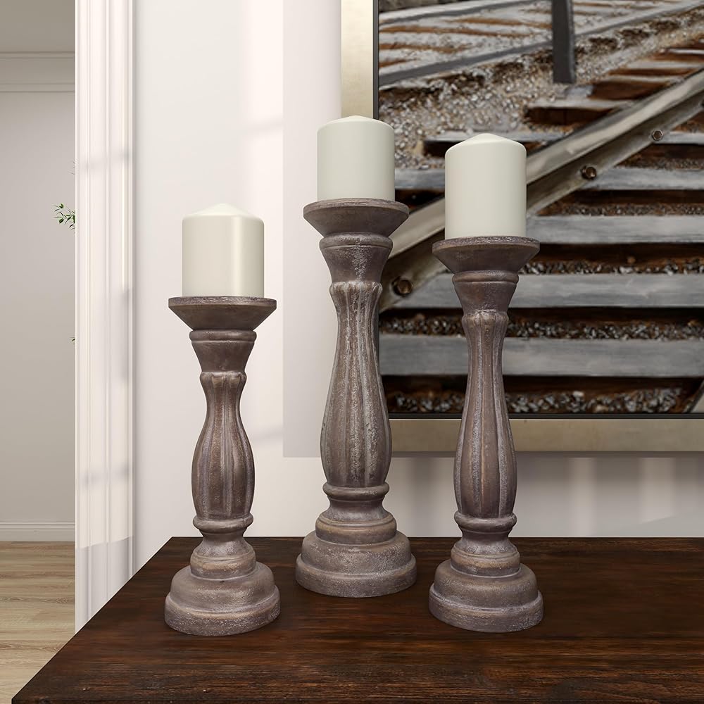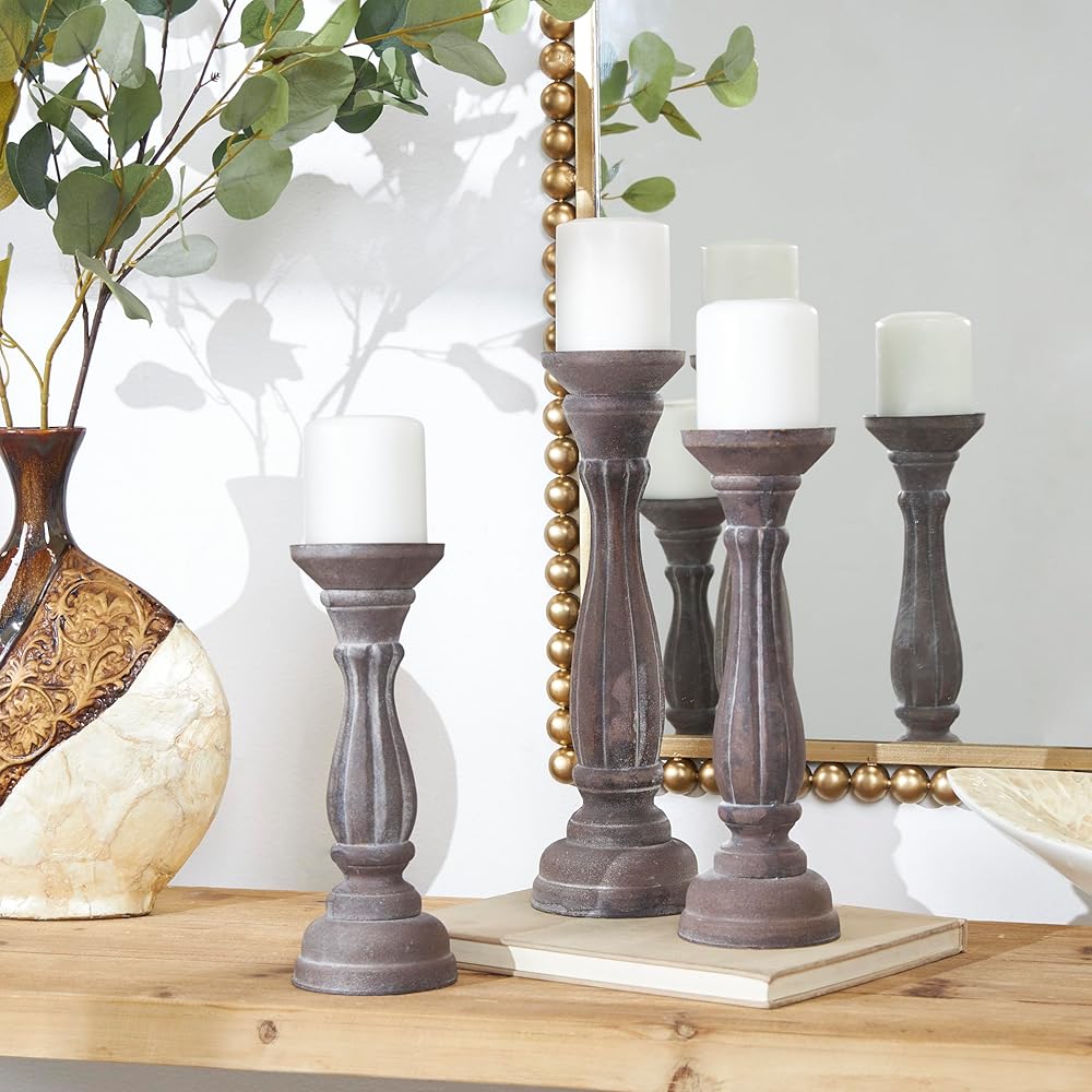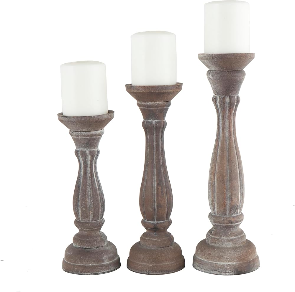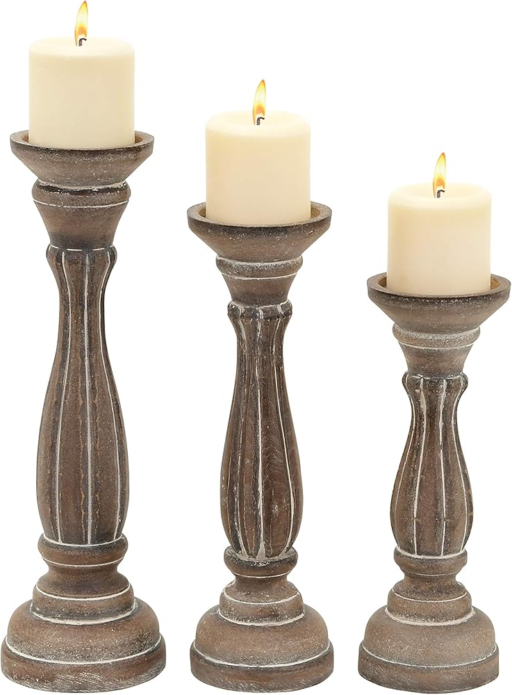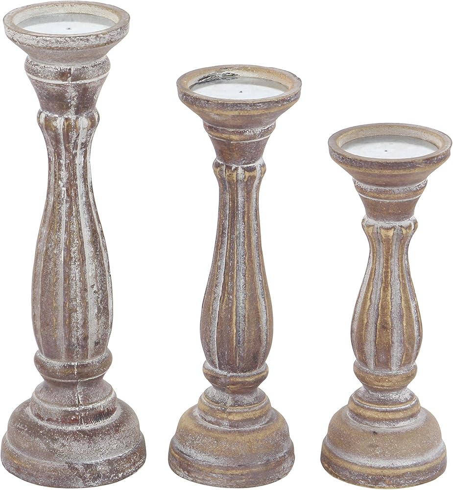 Give your space a radiant illumination with these beautifully crafted candle holders. Made with a sturdy base, it is perfect for creating an elegant atmosphere at your table top or mantel. Delight your guests and make any occasion extra special by adding a lighted or flameless candle to this candle holder centerpiece. Designed with felt or rubber stoppers at the base that prevent scratching furniture and table tops, as well as sliding around. Can hold 3 pillar candles. This item ships in 1 carton. Wood candle holder makes a great gift for any occasion. Suitable for indoor use only. This candle holder comes as a set of 3. Traditional style.
