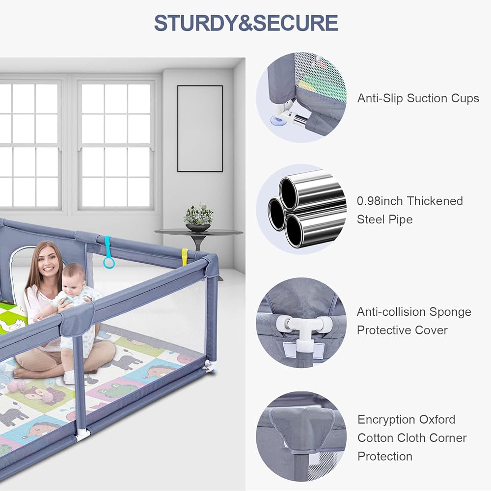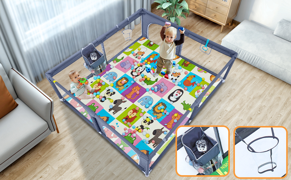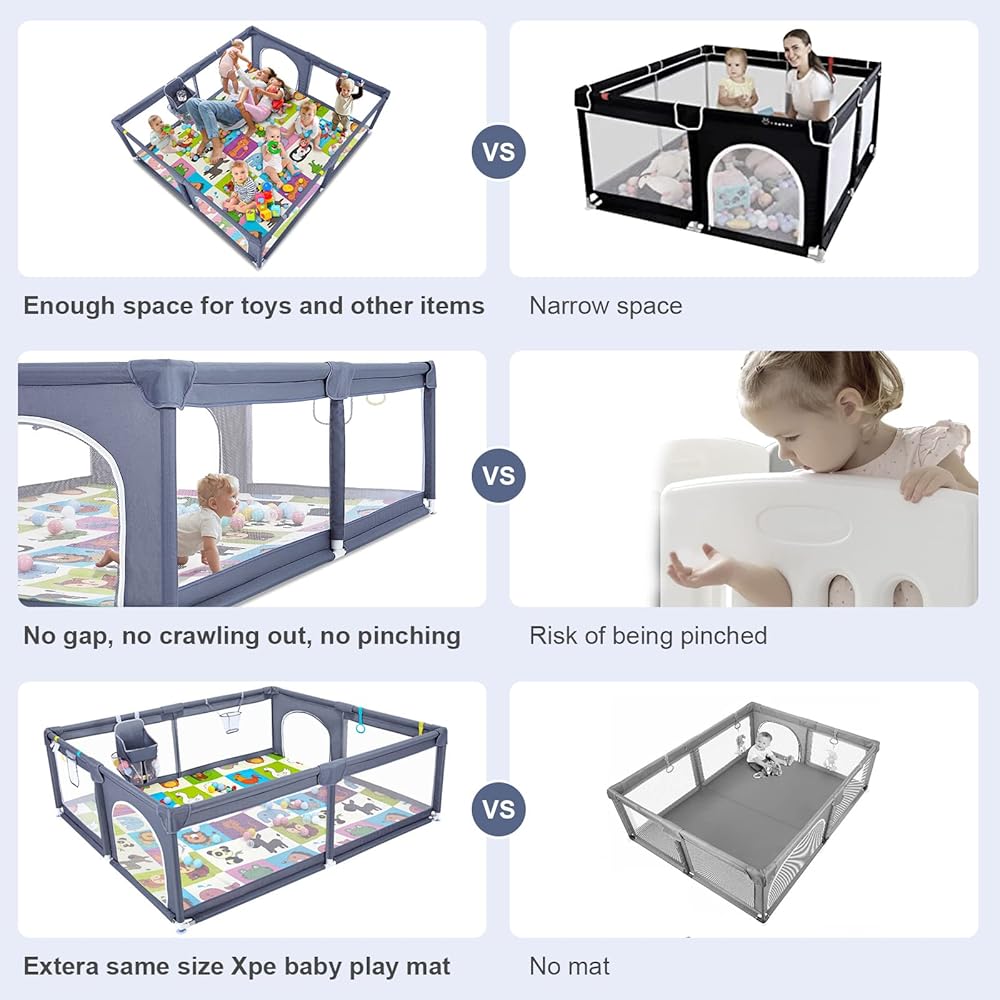 ساحة لعب كبيرة جدًا على عكس أقلام اللعب الضيقة الأخرى للرضع والأطفال الصغار، فإن ساحة اللعب الكبيرة جدًا الخاصة بنا كبيرة بما يكفي للآباء والعديد من الأطفال يلعبون معًا بشكل مريح. الارتفاع المعقول علميًا يجعل الطفل أكثر أمانًا. سطح سياج الطفل مصنوع من قطن أكسفورد الناعم الصديق للجلد، وهو آمن وصحي.