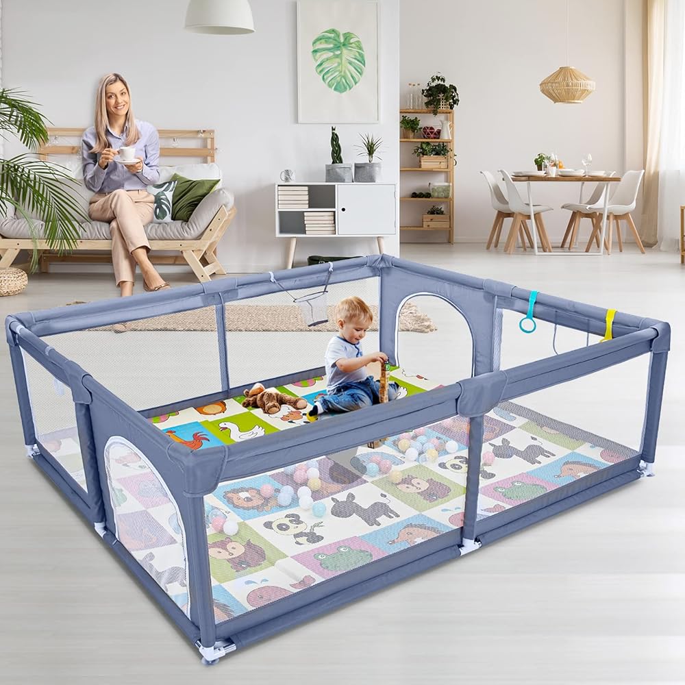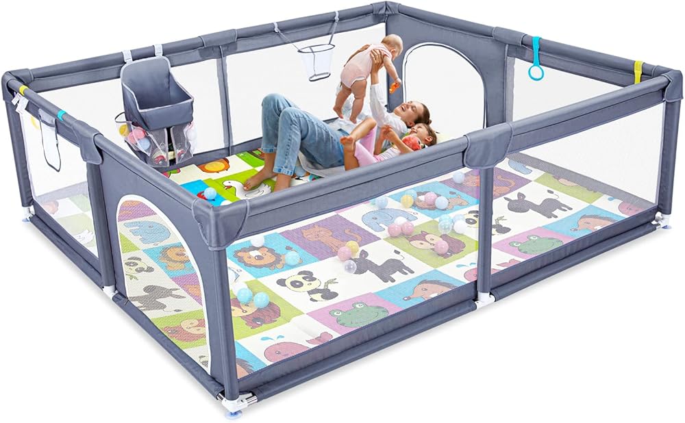 قفص لعب للأطفال مع حصيرة، قفص لعب كبير جدًا للأطفال الرضع والأطفال الصغار، ساحة لعب للأطفال مع كرة محيط، منطقة سياج للأطفال بدون فجوة مع شبكة مسامية، قفص أمان للأطفال (رمادي 199.56 سم × 183.44 سم)