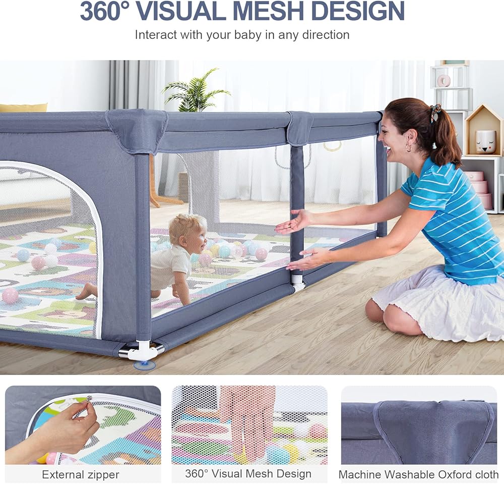 تصميم شبكي قابل للعرض 360 درجة - الجدران الجانبية الأربعة لقفص اللعب مصنوعة من شبكة جيدة التهوية مرئية، لا يوجد خطر ضيق. يمكن للطفل رؤيتك بسهولة من خلال قفص اللعب والشعور بالأمان، ويمكنك بسهولة الإمساك بحركات الطفل. يعتمد قفص لعب الأطفال على تصميم سحاب خارجي لمنع الطفل من التعرض للأذى من خلال التسلل بعيدًا. الجزء السفلي مصنوع من مادة مقاومة للتآكل، وعدم الانزلاق، ومسامية، وسهلة التنظيف من أكسفورد.