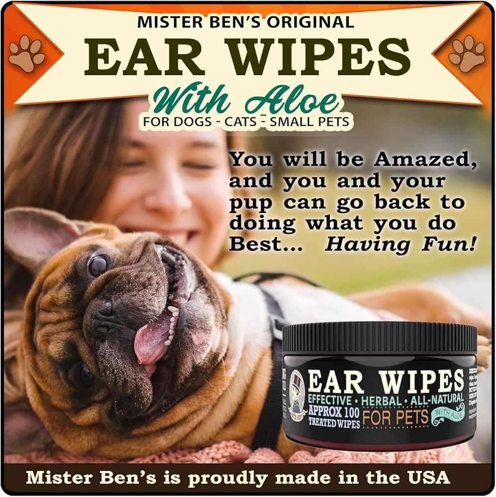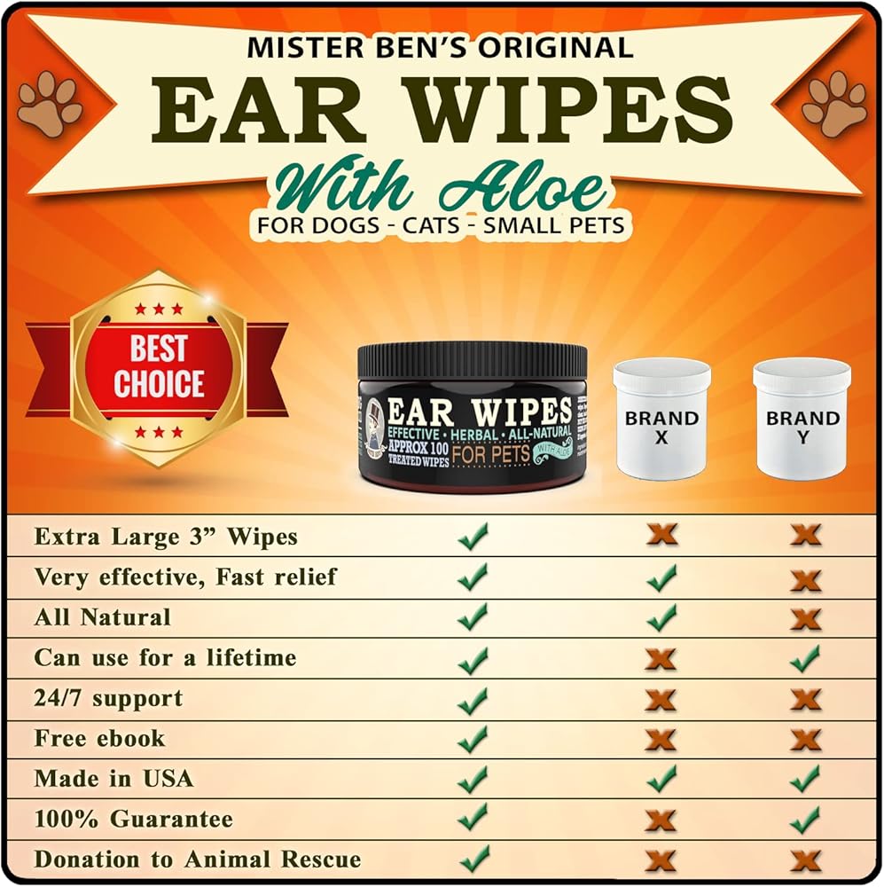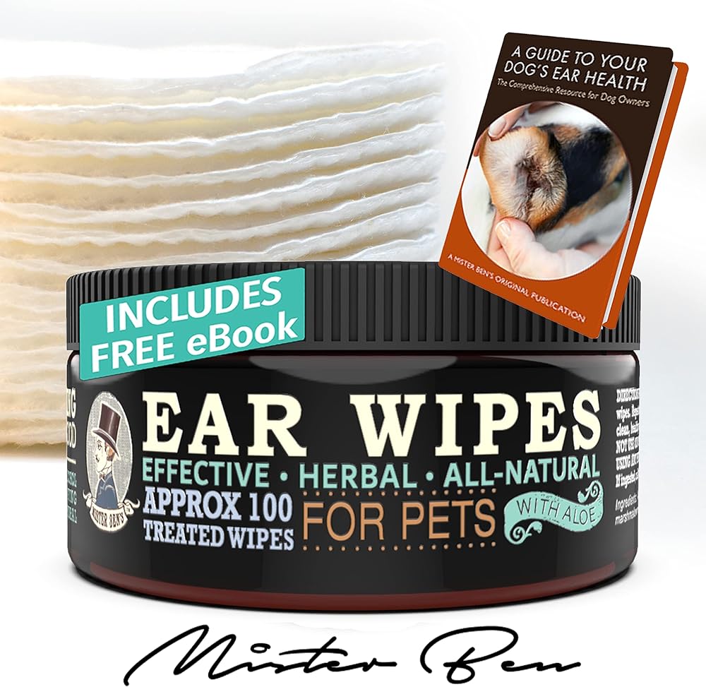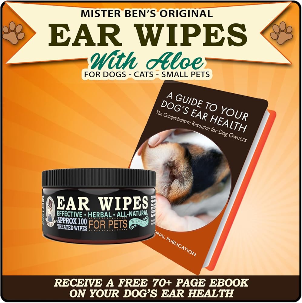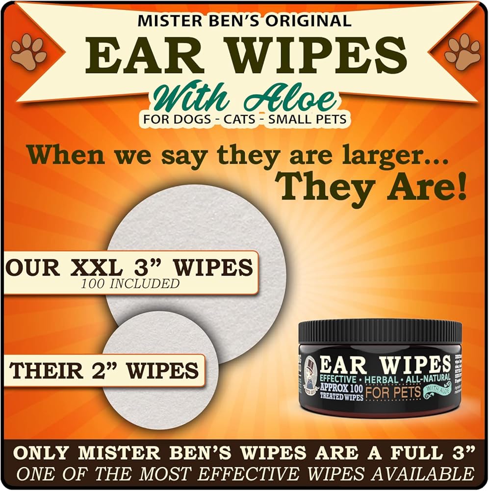 مناديل مبللة كبيرة جدًا مقاس 3 انش... مناديل أذن مهدئة وغير مهيجة للاستعمال مرة واحدة للكلاب. مناديل الأذن الأصلية من مستر بن بخلاصة الصبار للكلاب والقطط والحيوانات الأليفة الصغيرة وحتى الأرانب! – 100 منديل مبلل مع كتاب إلكتروني مجاني عن صحة أذن الكلاب أو القطط.
