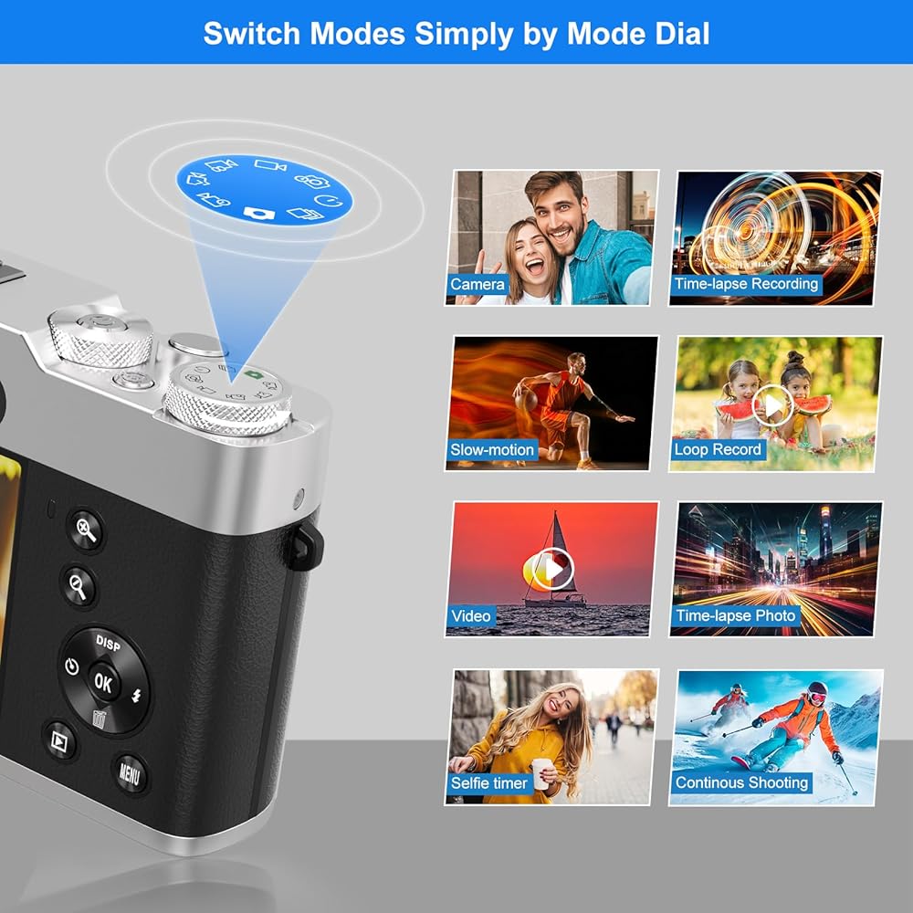 【قرص الوضع ومعين المنظر】- مع محدد المنظر الموجود على هذه النقطة والتقاط الكاميرات الرقمية، يمكنك عرض الصور في الوقت الحقيقي من الشاشة لتسهيل تكوينك، مما يسمح لك بإنتاج صور أكثر مثالية. تسمح لك هذه الكاميرا المخصصة لليوتيوب المزودة بقرص الوضع أيضًا بالتبديل بين الأوضاع المختلفة عن طريق لف الزر الدوار مما سيؤدي بالتأكيد إلى تحسين تجربة الاستخدام.