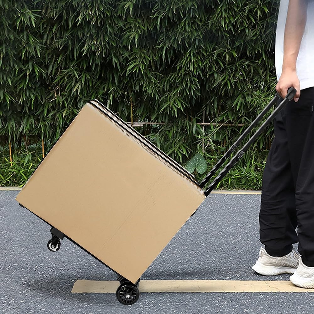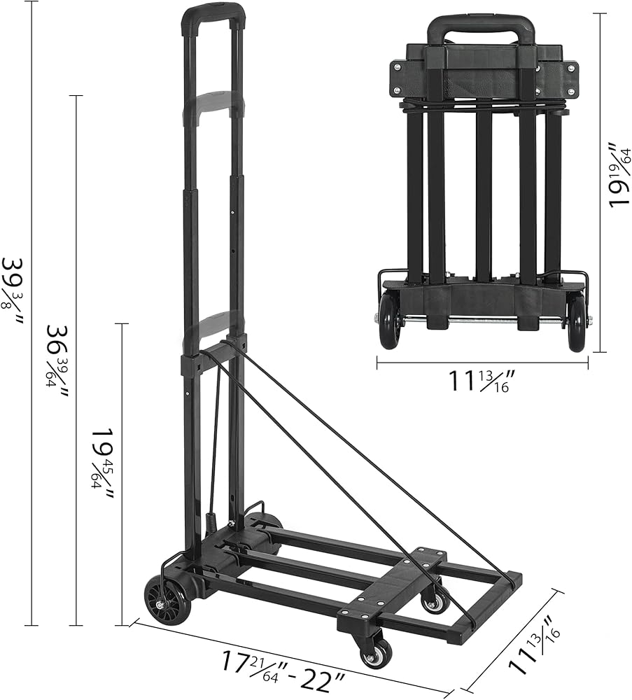 Foldable Compact Size Base Expand Size:20.5"x11",High of adjustable handle:39.5"/31.1"/19.7".Fold up size is 19”x11”x4”,weight: 6.9LB, easy to take it anywhere,convenient and perfect for moving.With extra 5.9inch Extendable Base,Can provide a better sense of security. Package included:Folding Cart *1