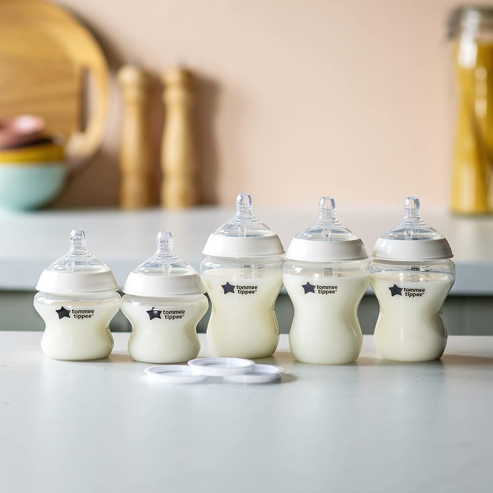محلول الزجاجة الأول من تومي تيبي، مجموعة زجاجات الأطفال مع زجاجات أطفال أقرب إلى الطبيعة، حلمات تشبه الثدي مع صمامات مضادة للمغص وأغطية للسفر