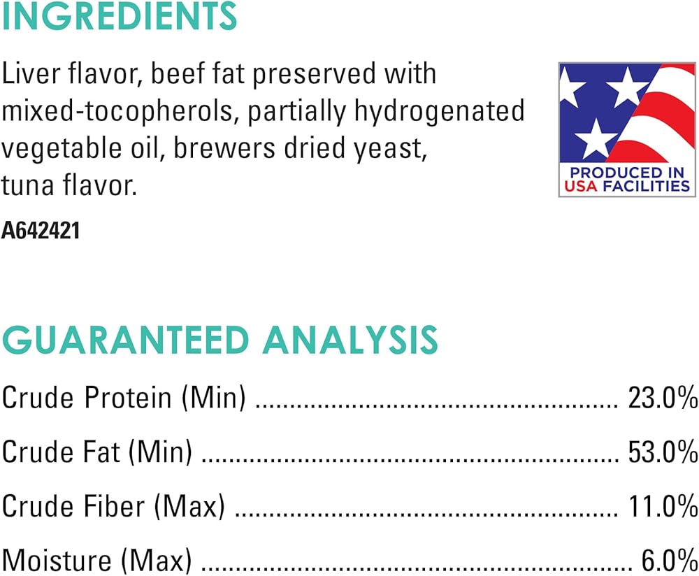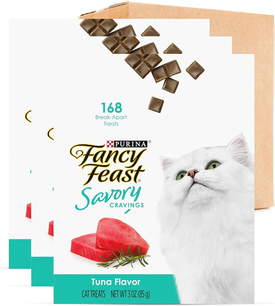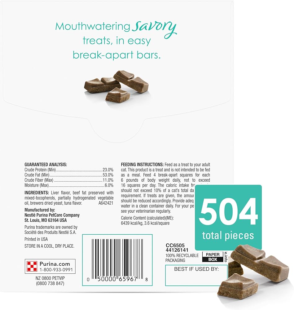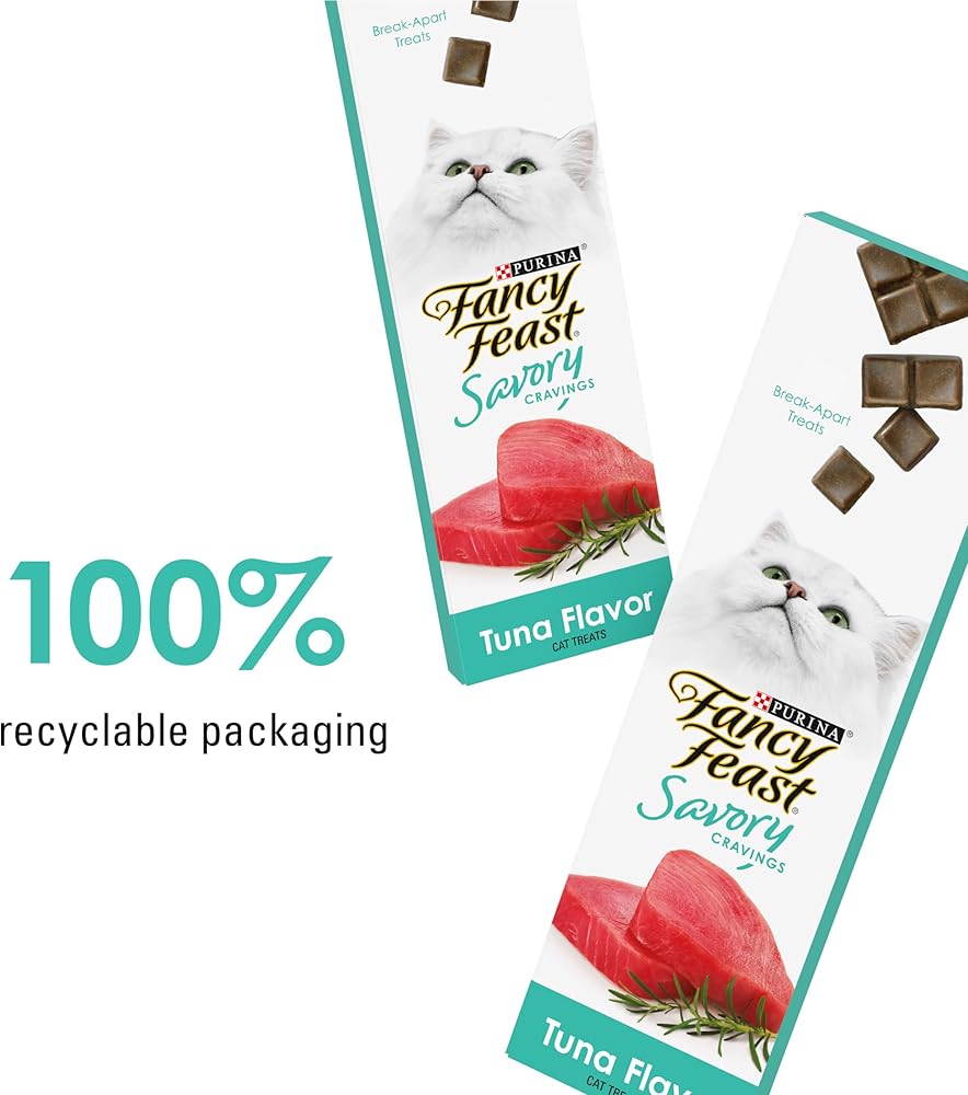 Enhance treat time with Purina Fancy Feast Savory Cravings Tuna Flavor cat treats. We make these limited ingredient cat treats with no artificial colors, flavors or preservatives. An alternative to traditional, crunchy dry cat treats, our innovative tender and soft cat treats prolong the enjoyment for both of you. The break-apart bars let you spend more time nurturing the deep bond you share with your special cat as she slowly savors each tender morsel. Indulge your feline companion with all five mouthwatering flavors of Purina Fancy Feast Savory Cravings natural cat treats from a brand you know and trust. In addition to this box of enticing Tuna Flavor soft treats for cats, our purr-fectly delectable recipe lineup includes flavors of Salmon, Beef, Chicken, and Beef and Crab for her snacking delight. Pamper your precious cat with an elevated treating experience when you offer her Purina Fancy Feast Savory Cravings cat snacks she can relish one small bite at a time.