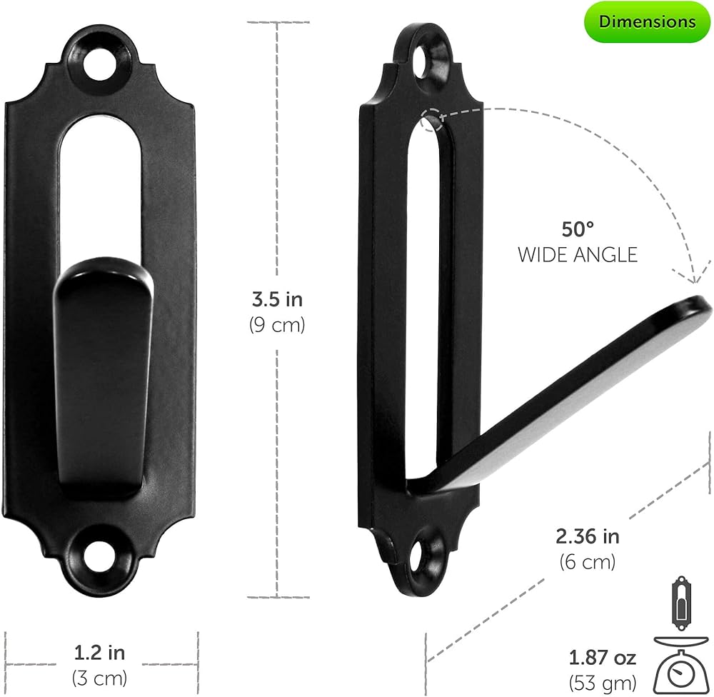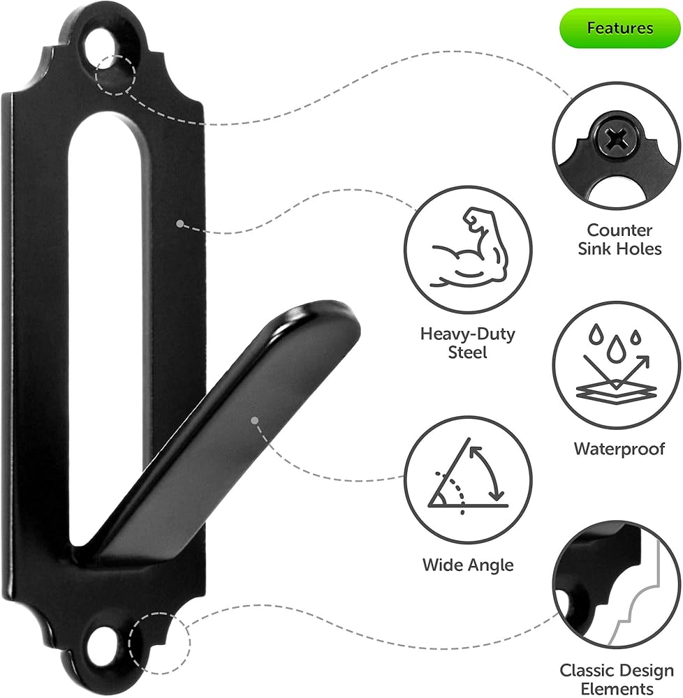 Your durable 5 mounting hooks have a smooth finish and are made from a thick steel design with a black coating that prevents weathering and rusting. They can be used both indoors and out and all have counter sink holes, are waterproof and have a wide 50 degree angle. Each hook can hold up to 50lbs (22kg).