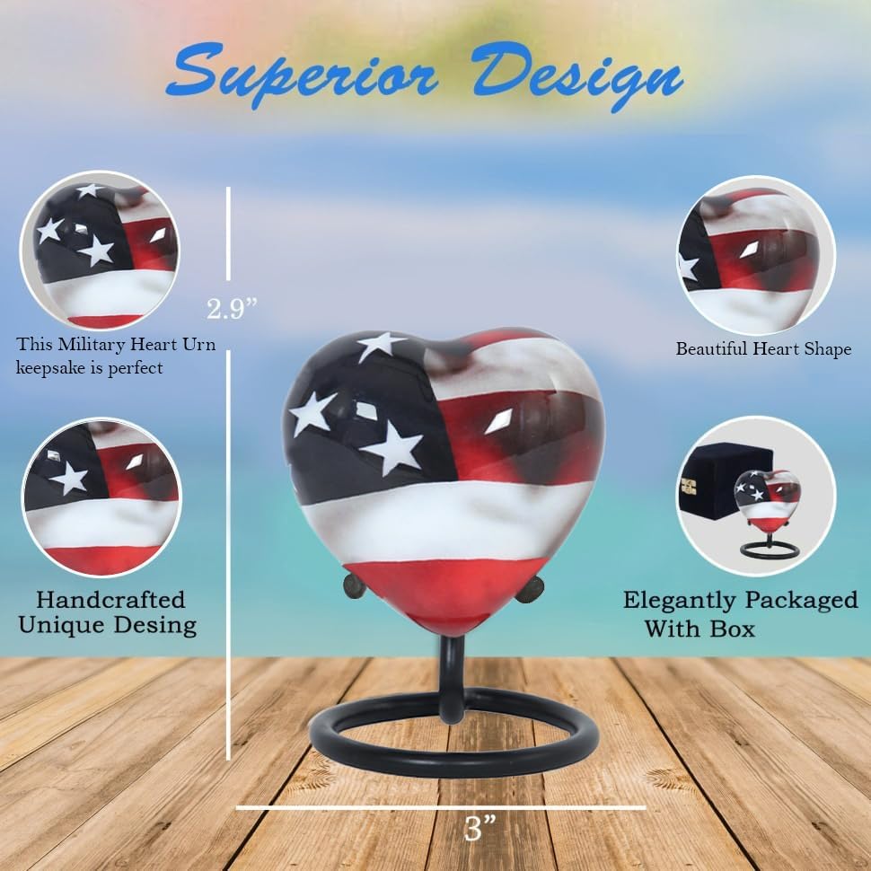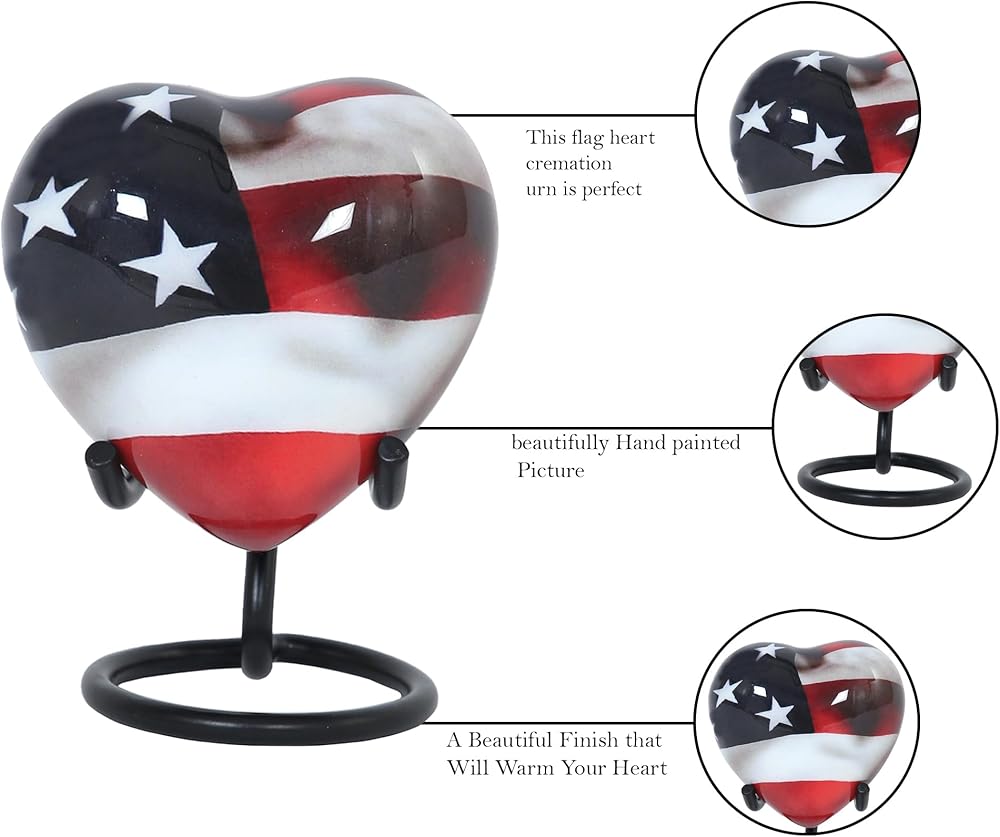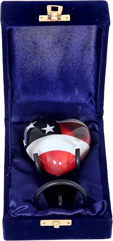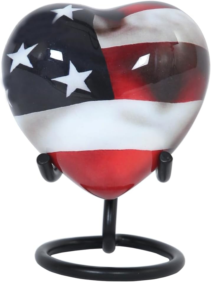 American Flag Cremation Urn: This American Glory Heart Keepsake mini urn for ashes is a unique and meaningful way to honor the memory of a loved one who has passed away. The heart shaped cremation urn can symbolize the love and patriotism that the person held in their heart.