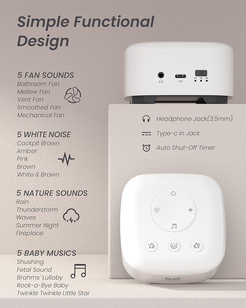 Premium White Noise Machine: With one-click operation and four types of audio sources independent of four buttons, this sound machine is simple and intuitive to use. Its small size (6.9 oz, 3.5" x 3.5" x 2") makes it the perfect addition to any bedroom or nursery, while its simple color matching perfectly into the atmosphere of home furniture