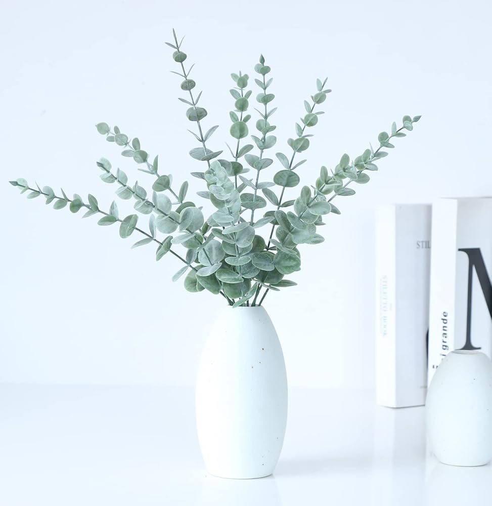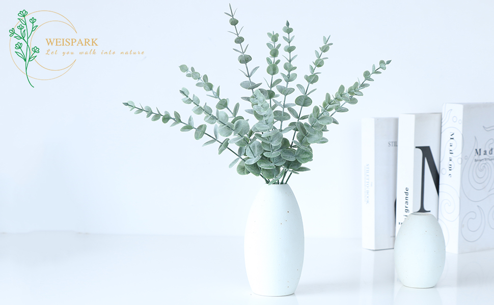 أوراق سيقان الأوكالبتوس الاصطناعية من WEISPARK - 25 قطعة من أوراق الأوكالبتوس المزيفة ذات اللمس الحقيقي وأغصان نبات الأوكالبتوس الصناعي لمزهرية DIY باقة مركزية لديكور المنزل والزفاف (بدون مزهرية) (25 قطعة)
