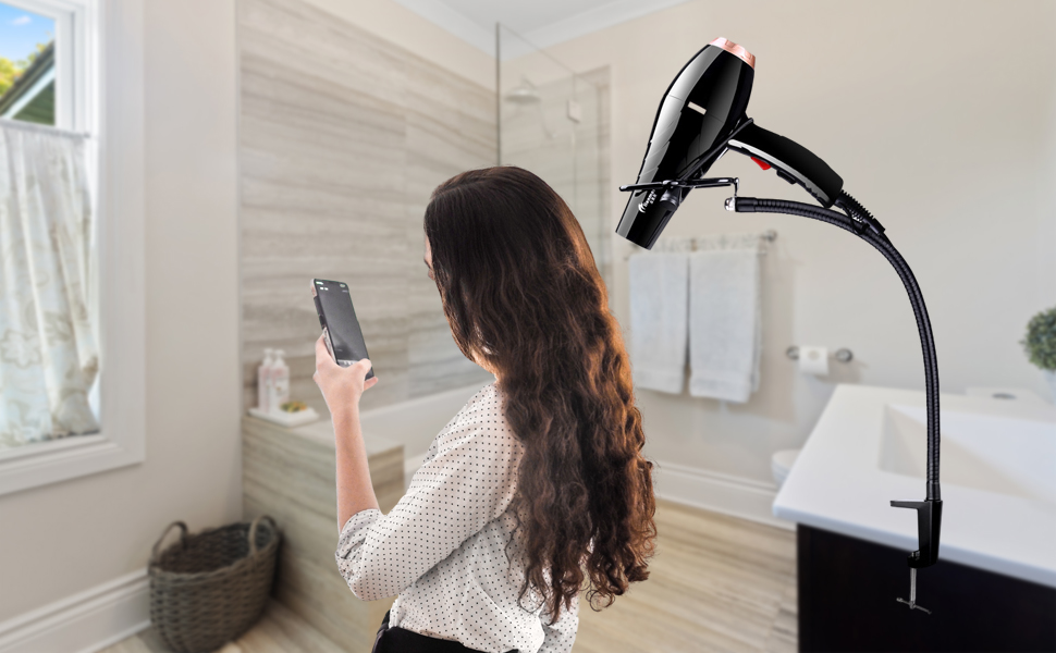 • Our adjustable arm securely holds your blow dryer in place, freeing up your hands for blowing your hair and easier pet grooming.