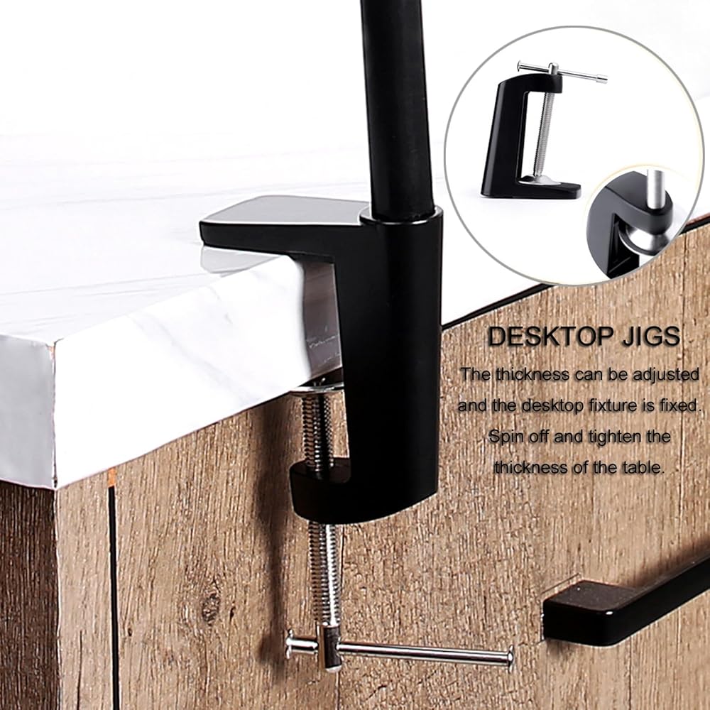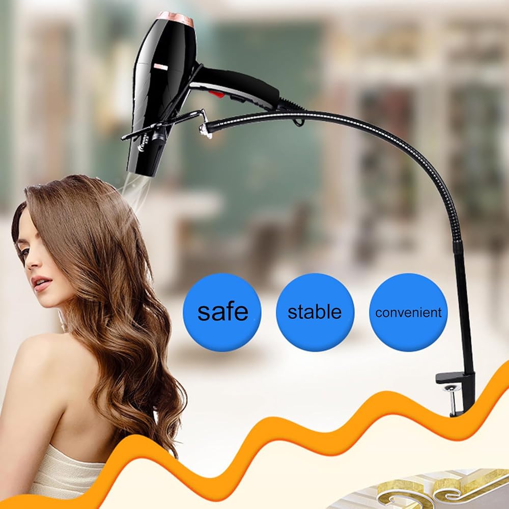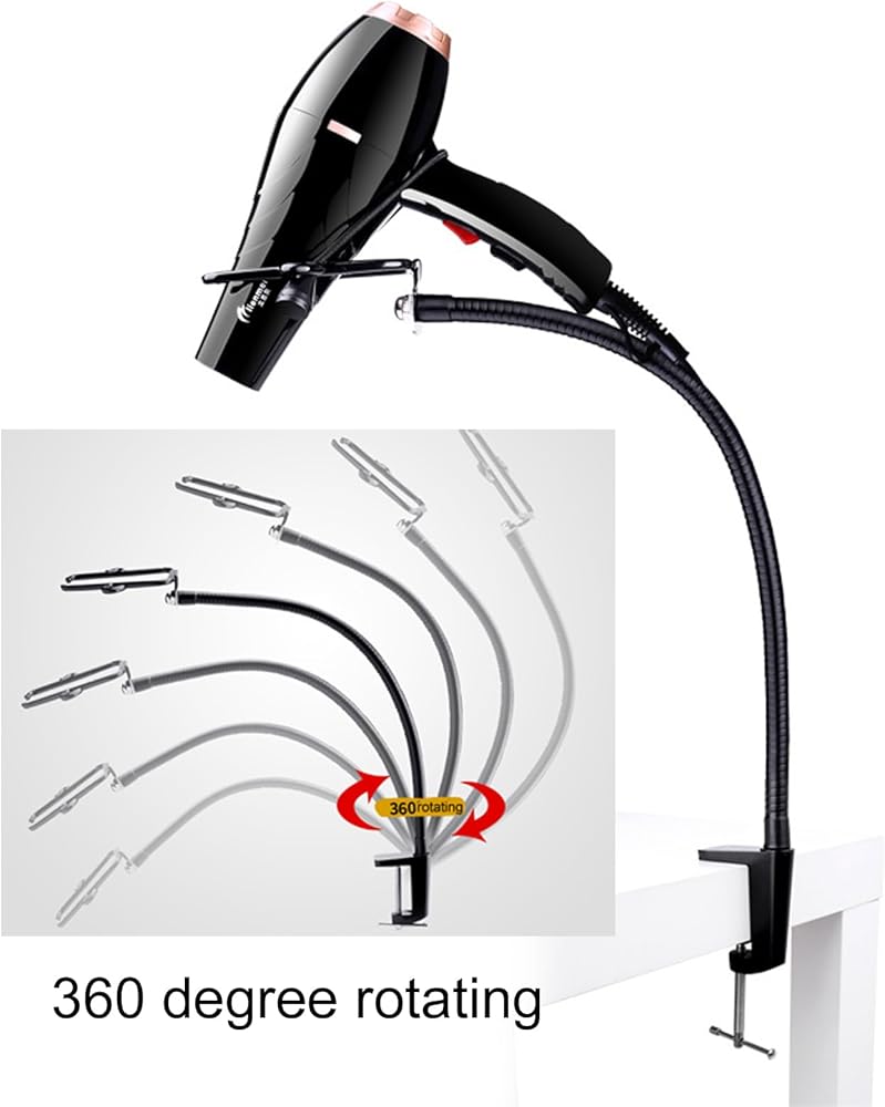 • 360 degree rotation neck dryer holder, easy to adjust any angle you need. The bottom is a adjustable clamp to fits different thickness.