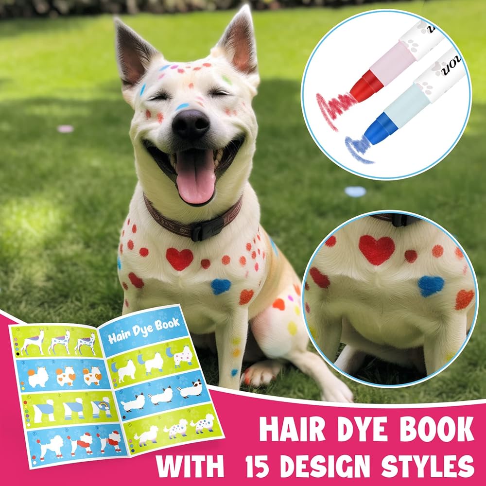 [Easy to Use] Hand-Sized hair color crayons are easy to apply on pet hair. A hair dye book provided 15 kinds of pet hair design ideas, follow it, or DIY unique hairstyles for your cute pet.