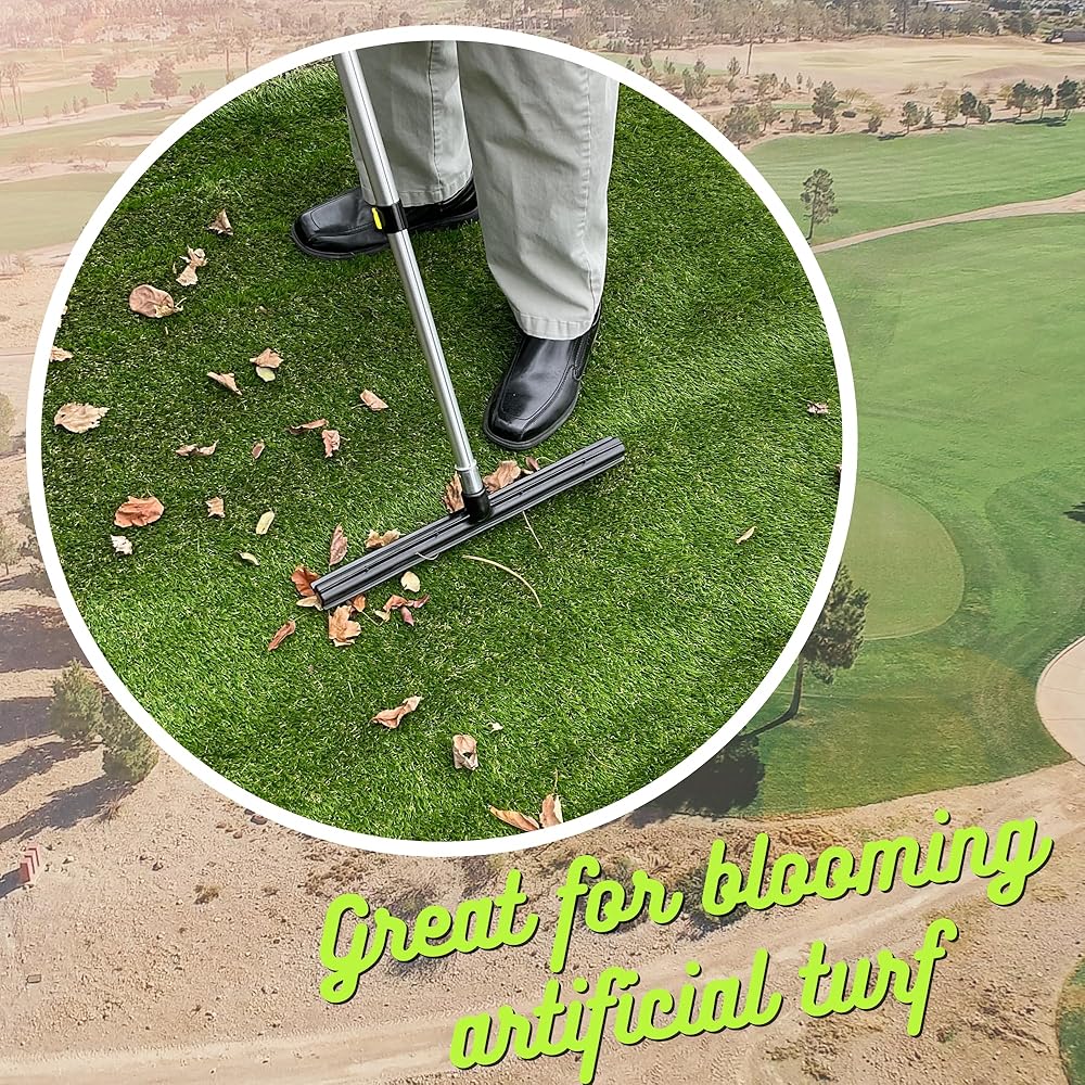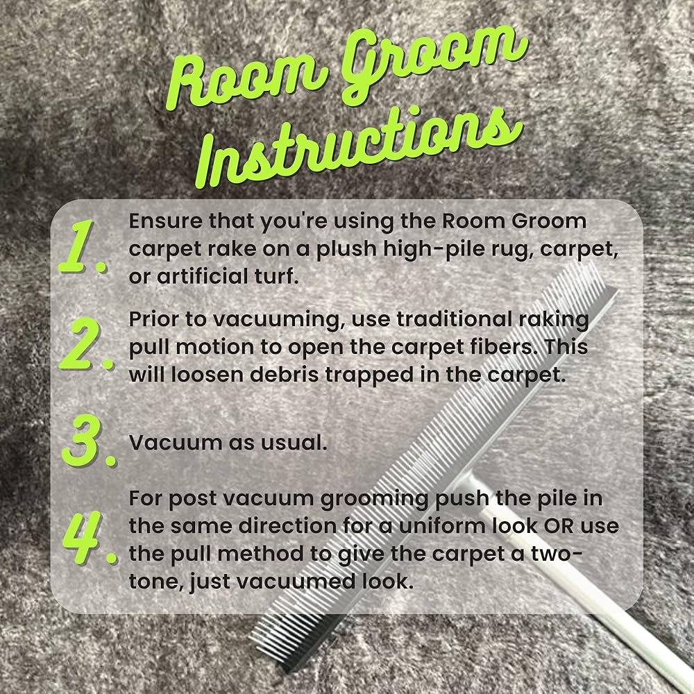 INSTANTLY IMPROVE APPEARANCES: The Room Groom's long nylon tines reach deep into the fibers of any type of shaggy carpets or rugs and pull the blades upright to provide a maximum bloom. Using short strokes over the area, quickly works any type of infill material in between the blades. This carpet rake can also be used on rtificial turf grass.