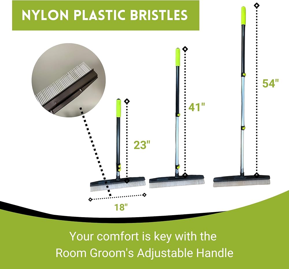 ROOM GROOM DIMENSIONS: The broom head on this carpet rake measures 18 inches long and two inches wide, it covers large areas quickly so less time in required to finish refreshing a room. The bristles are 1.5 inches long. The handle extends from 23 inches to 54 inches.
