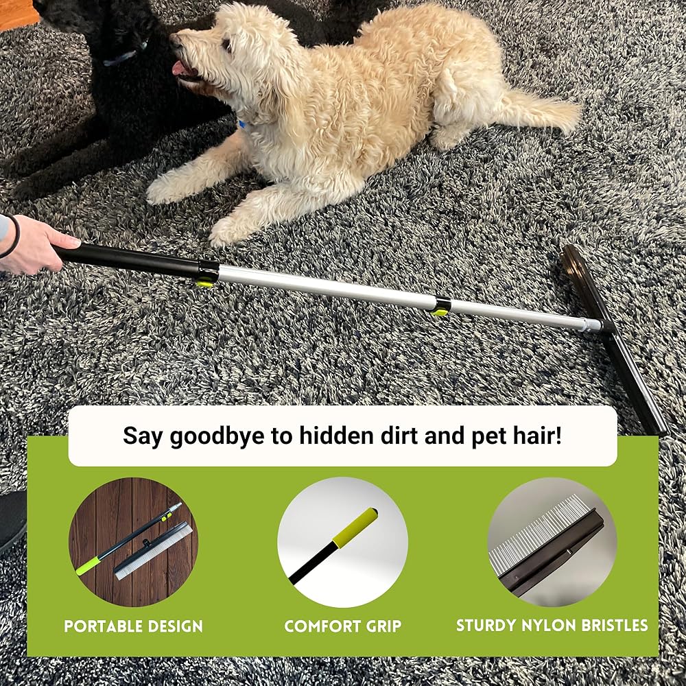 ADJUSTABLE HANDLE: The Room Groom carpet rake features a 3-section heavy duty telescoping handle made of durable metal, you can adjust the length of the sturdy pole from 23" to 54" and lock to any available desired size. Suitable for people of different heights, it can also be shortened for ease of kids' use.