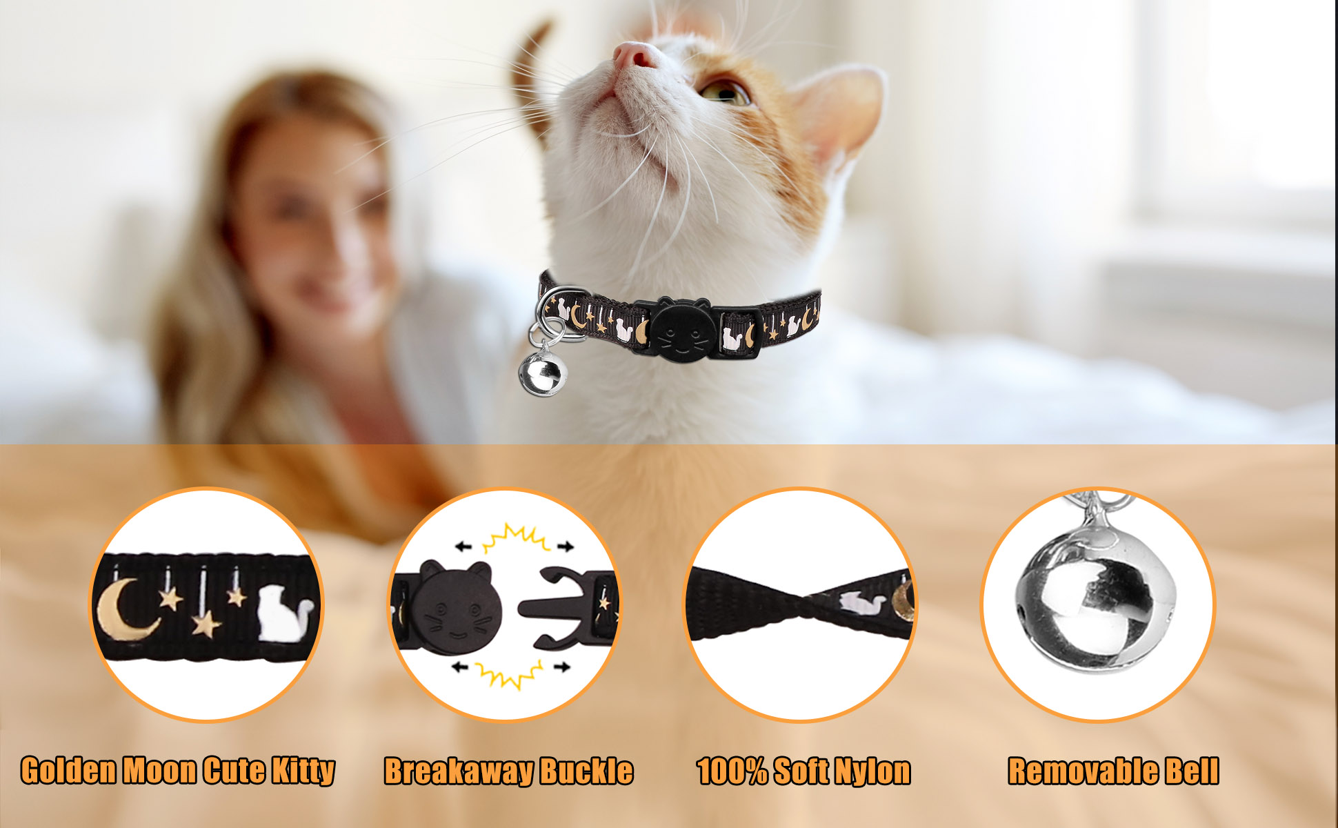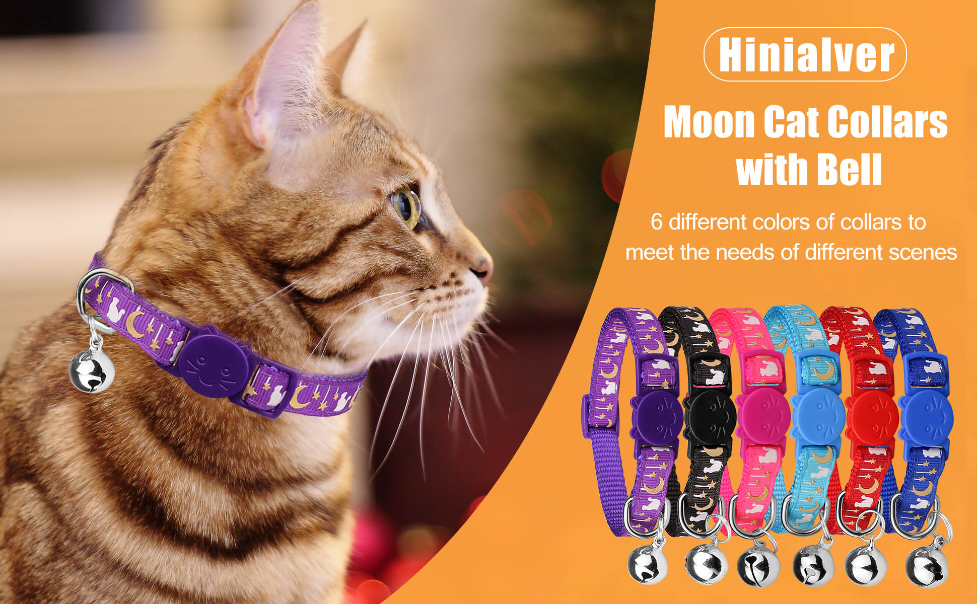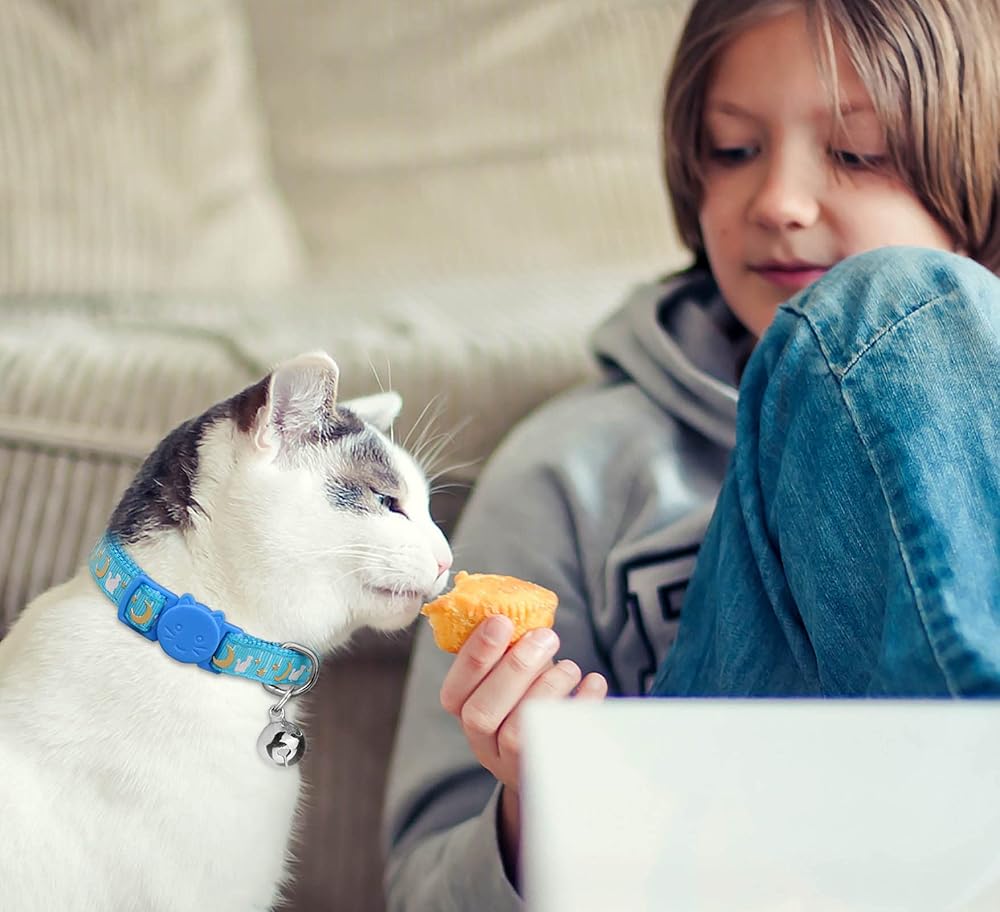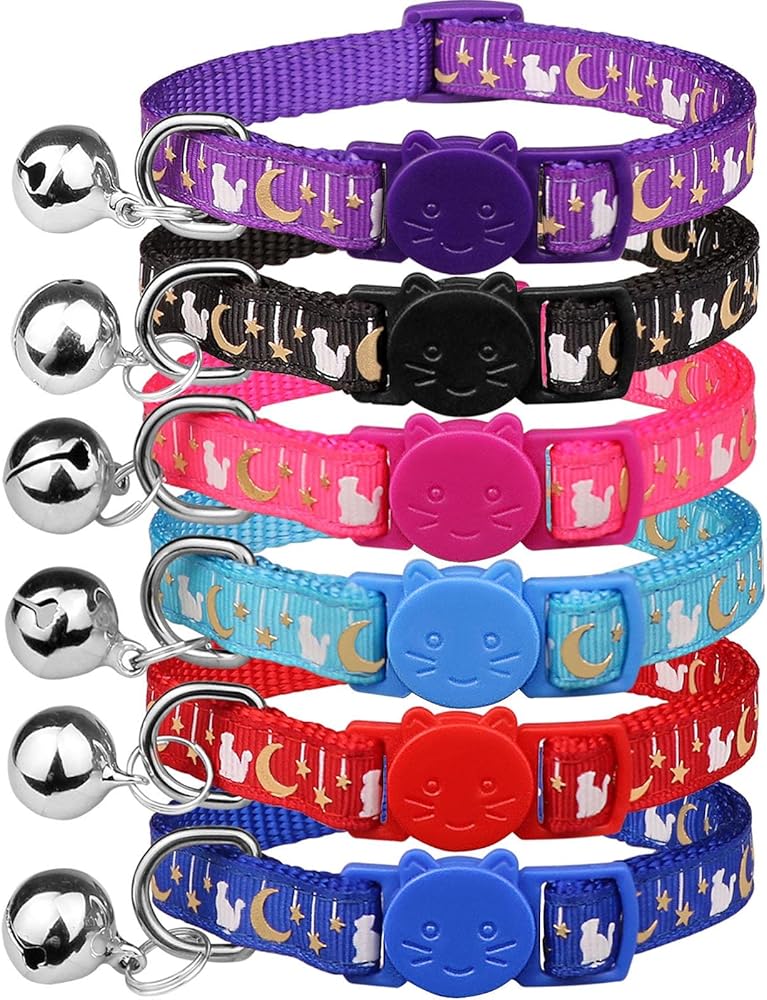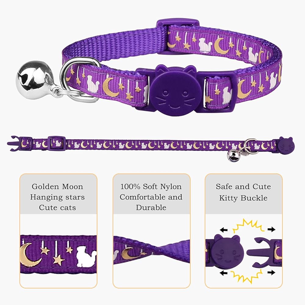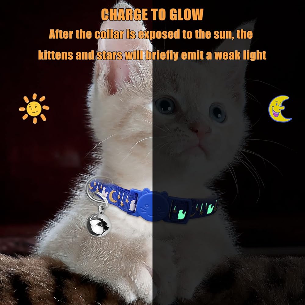 6 قطع من اطواق القطط القابلة للفصل، اطواق القطط بتصميم قمر ذهبي ومشبك امان مع جرس يتوهج في الظلام، اطواق قطط للاولاد والبنات