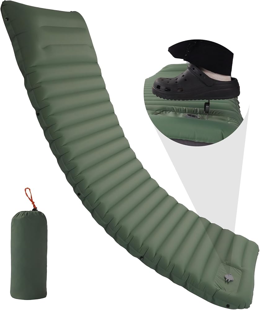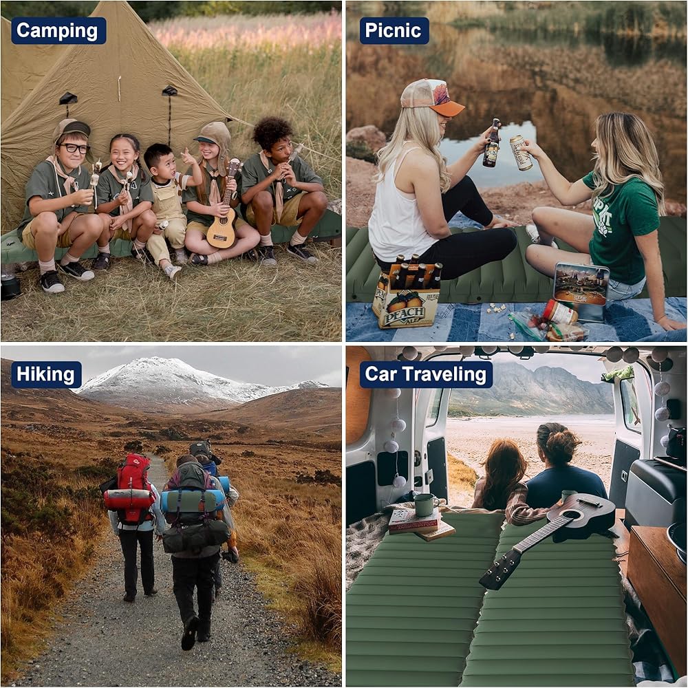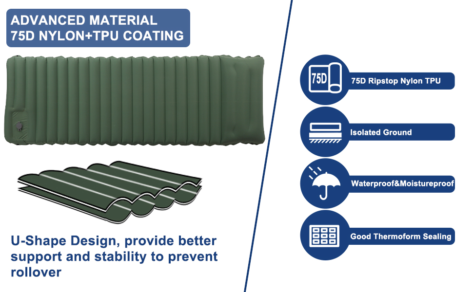 راحة قصوى للتخييم: تتميز وسائد النوم الخاصة بنا بتقنية دعم الرباط الفريدة من نوعها. على عكس المراتب الهوائية الموجودة في السوق، تفصل هذه التقنية وحدات دعم الهواء بشكل فردي لتناسب منحنيات الجسم وتوزع الجاذبية بشكل فعال، مما يسمح للمرتبة الهوائية بحمل ما يصل إلى 440 باوند.