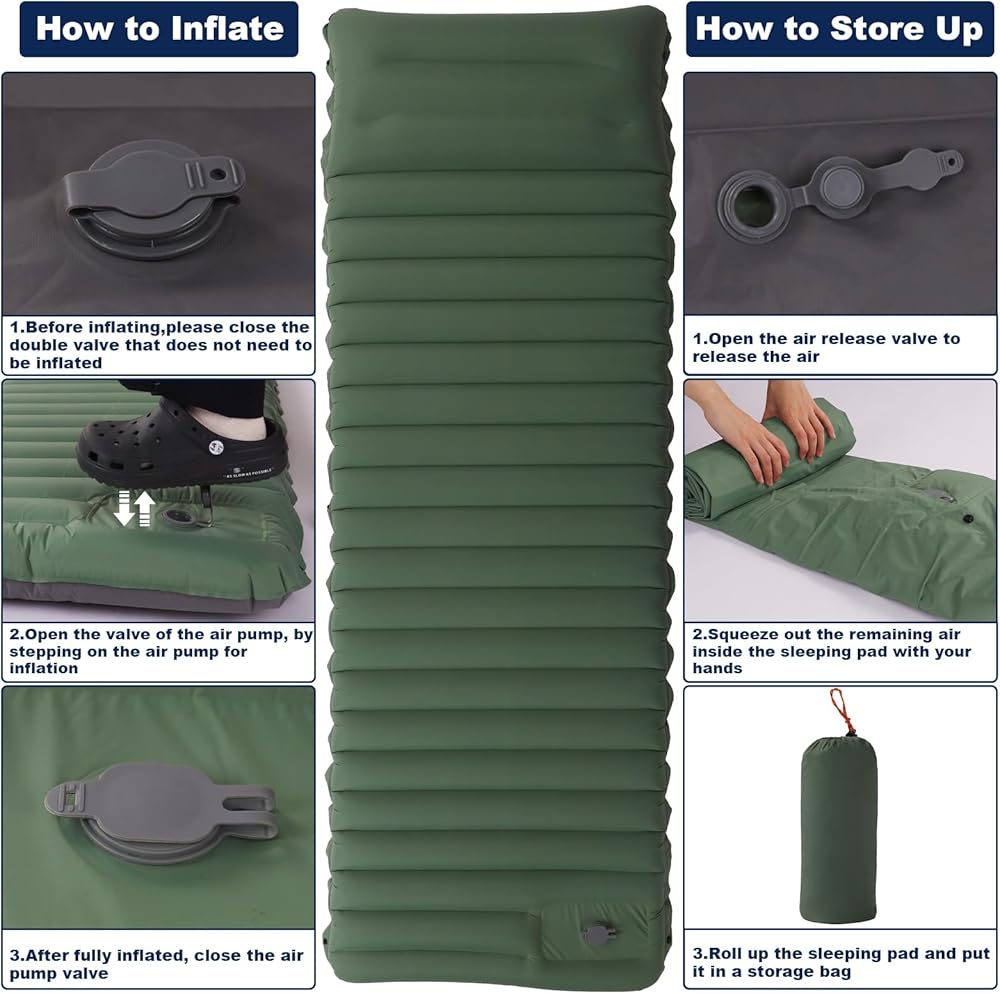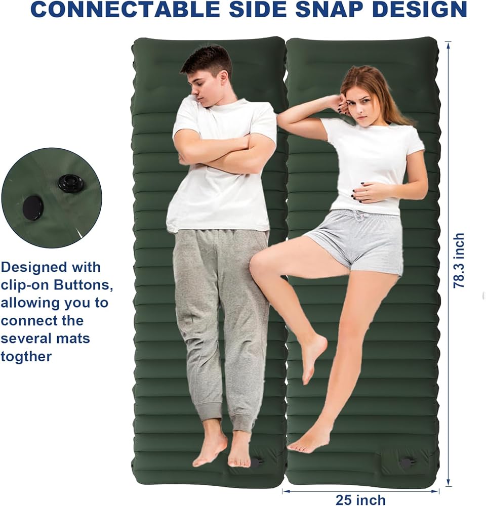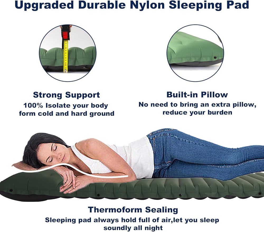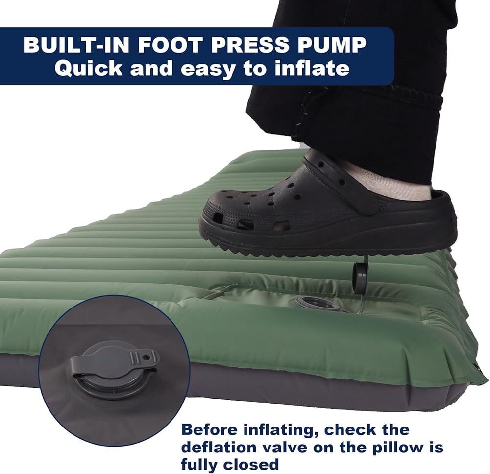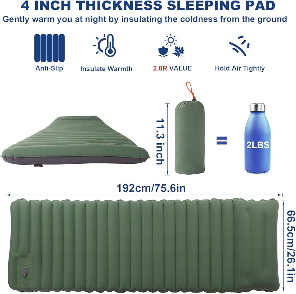 سمك إضافي 4 انش، راحة مطورة: تم تصميم وسادة النوم للتخييم هذه لمحبي التخييم في الهواء الطلق، سمك مطور 4 انش يبقيك بعيدًا عن الأرض، مما يمنحك الدفء والشعور بالراحة مثل النوم في السرير. الحجم القابل للنفخ: 75 × 26 × 4 انش، يبلغ عرض وسادات النوم الخاصة بنا المزودة بوسادة 26 انش للحفاظ على جسمك بعيدًا عن الأرض وعزل البرودة، مما يضمن أقصى قدر من الراحة والدفء لنومك طوال الليل.