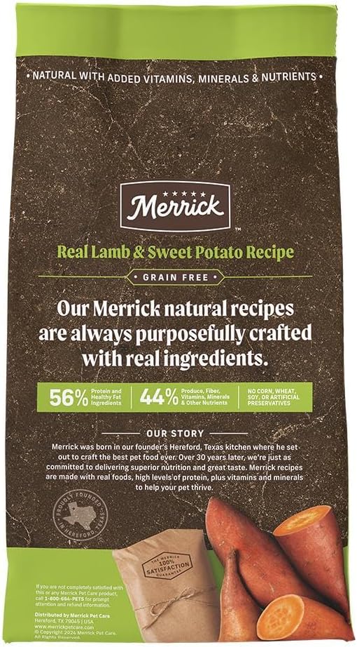Merrick Dry Dog Food Real Chicken and Sweet Potato Grain Free Dog Food Recipe is crafted with whole foods and deboned chicken as the first ingredient in this real meat dog food. Providing high-quality protein, this Merrick grain free dog food recipe helps build and maintain healthy muscle tissue and energy levels. With 65% protein and healthy fat ingredients and 35% produce, fiber, vitamins, minerals and other natural ingredients, this complete and balanced natural dog food is rich in protein and fiber. Leading levels of omega fatty acids in this adult dog food help support your dog's healthy skin and coat. This high protein dog food helps maintain healthy hips and joints by providing leading levels of glucosamine and chondroitin for dogs. This grain free dry dog food contains no corn, wheat, soy, gluten or artificial colors, flavors or preservatives. Merrick dog food recipes are crafted in our Hereford, TX kitchen and cooked in the USA.