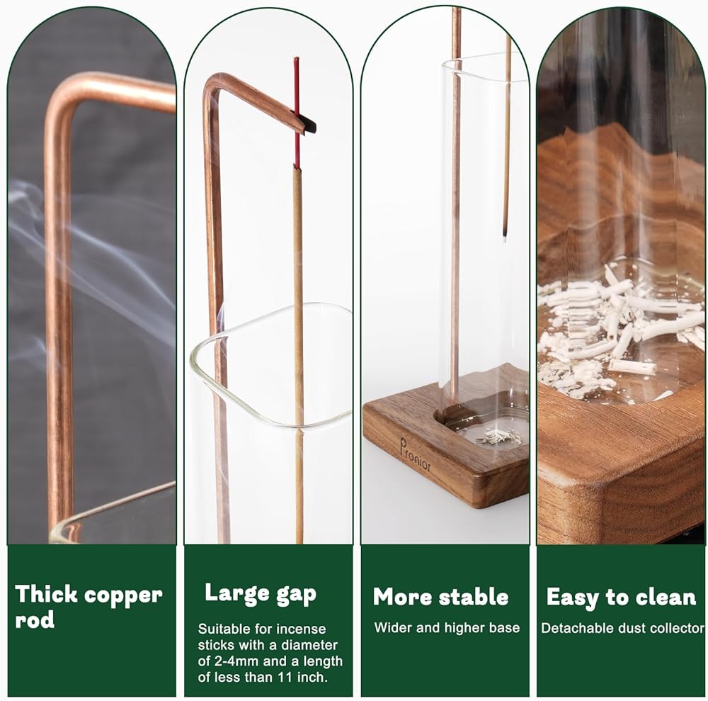 • يلتقط جميع رماد البخور -- بدون فوضى: يجمع الكوب الزجاجي عالي البورون المقاوم للحرارة الرماد بفعالية؛ بالإضافة إلى ذلك، يمكن إزالة مجمع الرماد وشطفه بالماء. يرجى تنظيف الرماد مرة واحدة في الشهر.