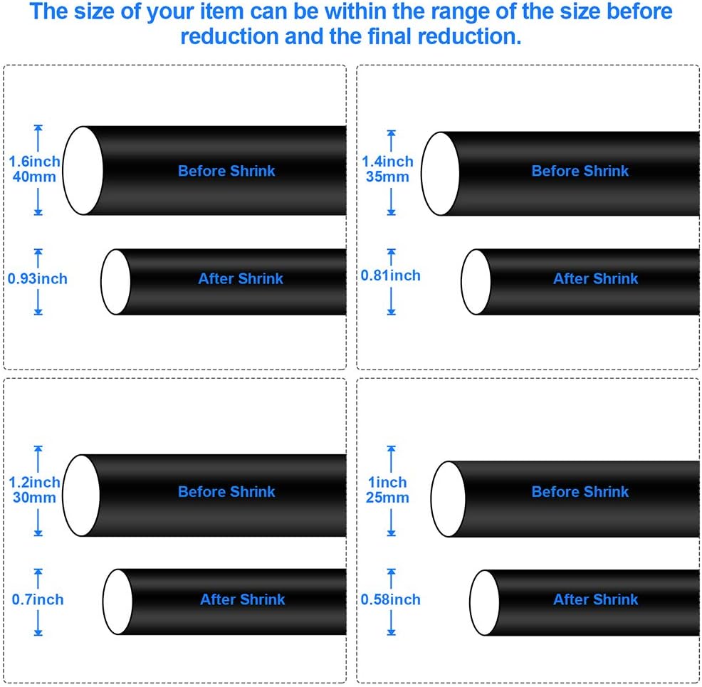 • 3. SHRINKABLE ENOUGH: The shrinkage ratio of the tube is 1.7:1, shrinkage temperature 100~115. Please be aware that open flame heating time should not be too long.